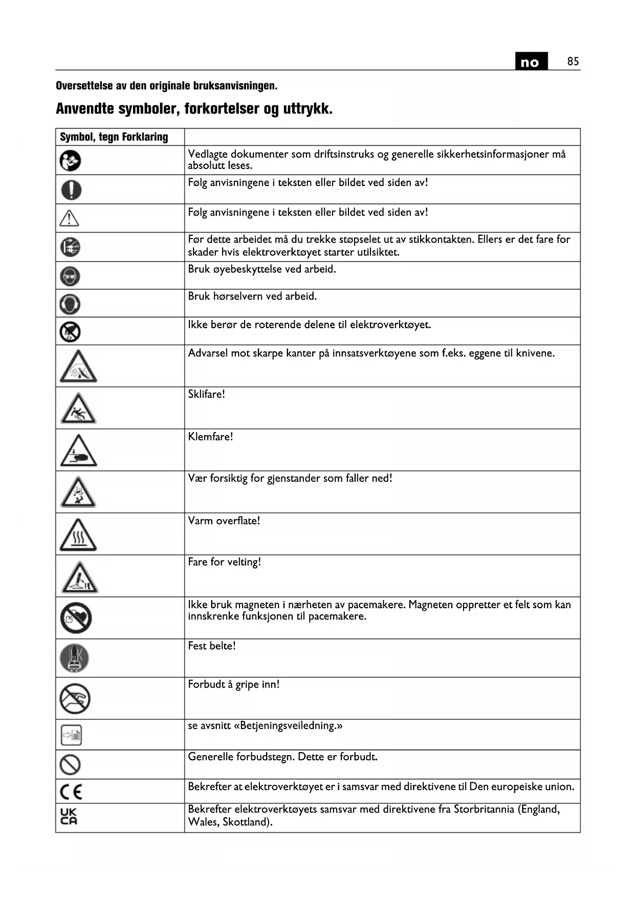 Oversettelse av den originale bruksanvisningen. Anvendte symboler, forkortelser og uttrykk. Symbol, tegn Forklaring Vedlagte dokumenter som driftsinstruks og generelle sikkerhetsinformasjoner må absolutt leses. Følg anvisningene i teksten eller bildet ved siden av! Følg anvisningene i teksten eller bildet ved siden av! Før dette arbeidet må du trekke støpselet ut av stikkontakten. Ellers er det fare for skader hvis elektroverktøyet starter utilsiktet. Bruk øyebeskyttelse ved arbeid. Bruk hørselvern ved arbeid. Ikke berør de roterende delene til elektroverktøyet. Advarsel mot skarpe kanter på innsatsverktøyene som f.eks. eggene til knivene. Sklifare! Klemfare! Vær forsiktig for gjenstander som faller ned! Varm overflate! Fare for velting! Ikke bruk magneten i nærheten av pacemakere. Magneten oppretter et felt som kan innskrenke funksjonen til pacemakere. Fest belte! Forbudt å gripe inn! se avsnitt «Betjeningsveiledning.» Generelle forbudstegn. Dette er forbudt. Bekrefter at elektroverktøyet er i samsvar med direktivene til Den europeiske union. Bekrefter elektroverktøyets samsvar med direktivene fra Storbritannia (England, Wales, Skottland).86
