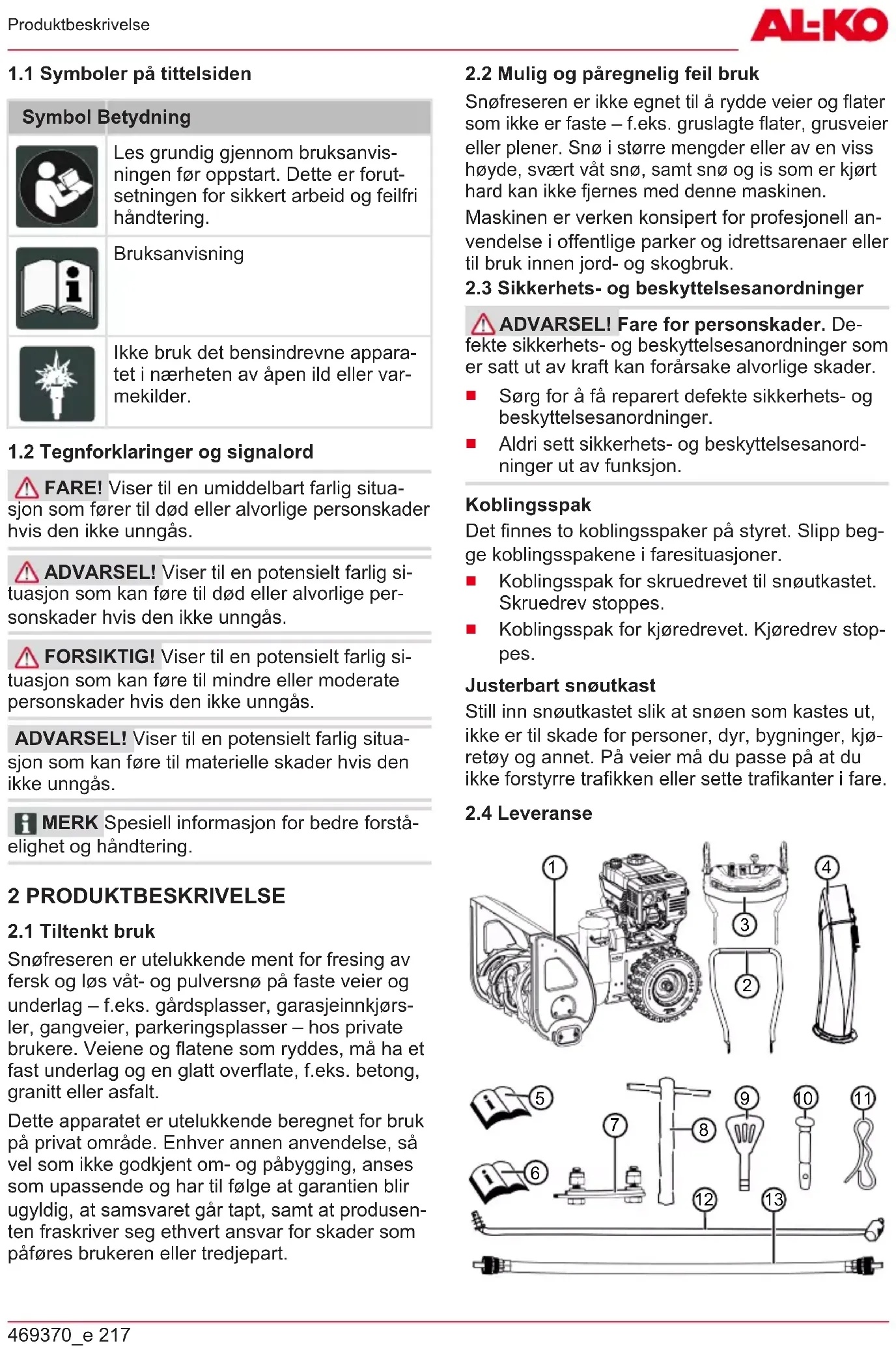 Symbol Betydning Advarsel! Vær spesielt forsiktig ved håndte- ring! Les bruksanvisningen før driften settes i gang! Hold bort fra utkastområdet. Fare på grunn av snøutkast. Bruk vernebriller og hørselsvern! Ikke ta på roterende deler. Inntrek- kingsfare! Symbol Betydning Ikke grip inn i snøutkast! Ikke grip inn i eller tråkk på mate- skruen! Slå av motor før arbeid på maski- nen. Trekk tennplugghette før vedlike- holds- og reparasjonsarbeider. Hold tredjepersoner unna fareområ- det! Roterende deler i utkastområdet! Inntrekkingsfare!