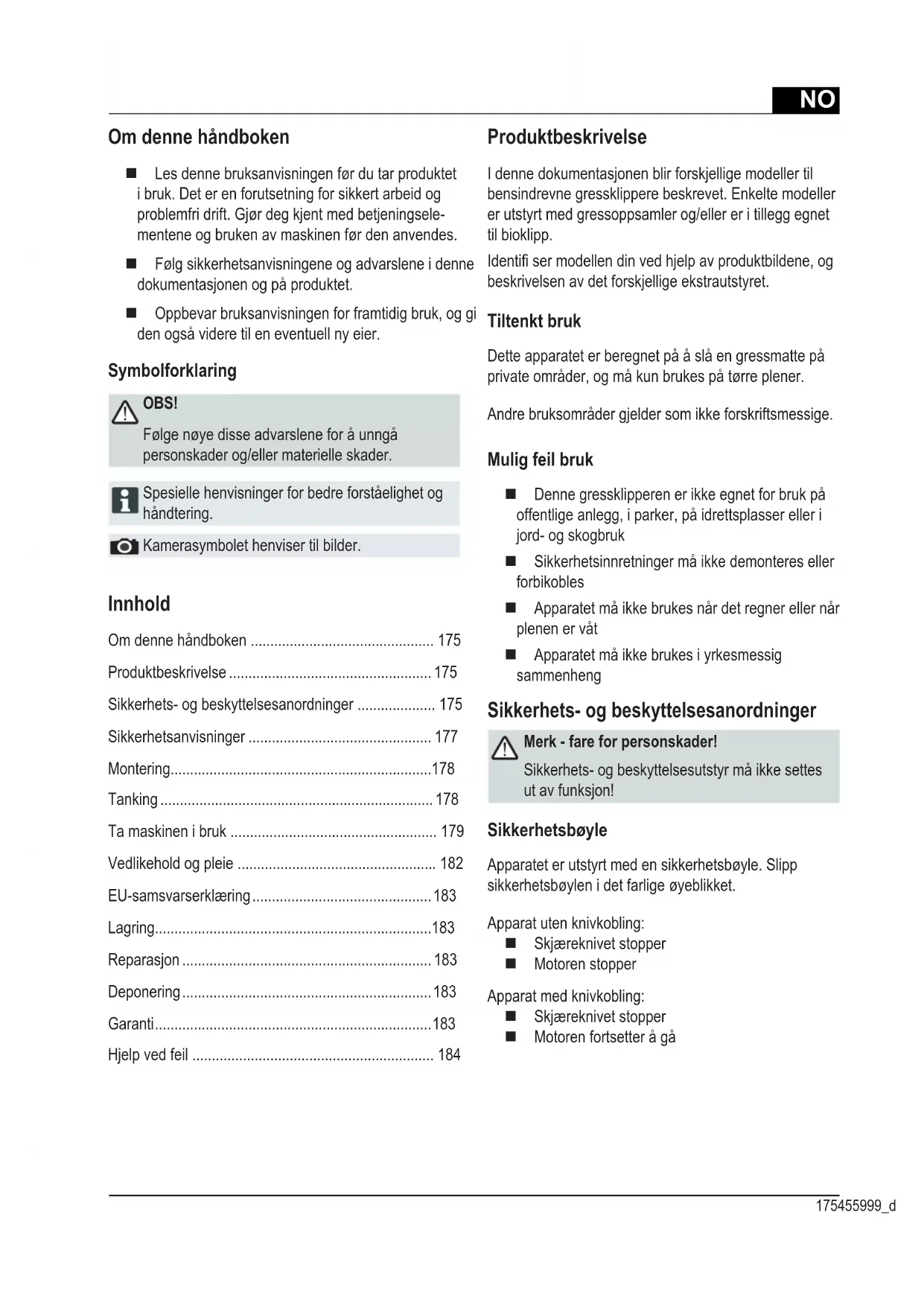 - Kontrollera kniv Kontakta en av våra servicestationer vid störningar som inte fi nns uppförda i denna tabell eller som du själv inte kan åtgärda.NO 175455999_d Innhold Om denne håndboken ............................................... 175 Produktbeskrivelse .................................................... 175 Sikkerhets- og beskyttelsesanordninger .................... 175 Sikkerhetsanvisninger ............................................... 177 Montering ................................................................... 178 Tanking ...................................................................... 178 Ta maskinen i bruk ..................................................... 179 Vedlikehold og pleie ................................................... 182 EU-samsvarserklæring .............................................. 183 Lagring ....................................................................... 183 Reparasjon ................................................................ 183 Deponering ................................................................ 183 Garanti ....................................................................... 183 Hjelp ved feil .............................................................. 184 Om denne håndboken Les denne bruksanvisningen før du tar produktet i bruk. Det er en forutsetning for sikkert arbeid og problemfri drift. Gjør deg kjent med betjeningsele- mentene og bruken av maskinen før den anvendes. Følg sikkerhetsanvisningene og advarslene i denne dokumentasjonen og på produktet. Oppbevar bruksanvisningen for framtidig bruk, og gi den også videre til en eventuell ny eier. Symbolforklaring OBS! Følge nøye disse advarslene for å unngå personskader og/eller materielle skader. Spesielle henvisninger for bedre forståelighet og håndtering. Kamerasymbolet henviser til bilder. Kamerasymbolet henviser til bilder. Produktbeskrivelse I denne dokumentasjonen blir forskjellige modeller til bensindrevne gressklippere beskrevet. Enkelte modeller er utstyrt med gressoppsamler og/eller er i tillegg egnet til bioklipp. Identifi ser modellen din ved hjelp av produktbildene, og beskrivelsen av det forskjellige ekstrautstyret. Tiltenkt bruk Dette apparatet er beregnet på å slå en gressmatte på private områder, og må kun brukes på tørre plener. Andre bruksområder gjelder som ikke forskriftsmessige. Mulig feil bruk Denne gressklipperen er ikke egnet for bruk på offentlige anlegg, i parker, på idrettsplasser eller i jord- og skogbruk Sikkerhetsinnretninger må ikke demonteres eller forbikobles Apparatet må ikke brukes når det regner eller når plenen er våt Apparatet må ikke brukes i yrkesmessig sammenheng Sikkerhets- og beskyttelsesanordninger Merk - fare for personskader! Sikkerhets- og beskyttelsesutstyr må ikke settes ut av funksjon! Sikkerhetsbøyle Apparatet er utstyrt med en sikkerhetsbøyle. Slipp sikkerhetsbøylen i det farlige øyeblikket. Apparat uten knivkobling: Skjæreknivet stopper Motoren stopper Apparat med knivkobling: Skjæreknivet stopper Motoren fortsetter å gåNO Oversettelse av original bruksanvisning Bensindrevet gressklipper1 Startsnor 10 Vario-gir*2 Hjuldrev* 11 Bruksanvisning3 Sikkerhetsbøyle 12 Utkasterinnsats*4 Ergonomisk høydejustering* 13 Deksel*5 Fyllenivåindikering* 14 Bioklippesett*6 Beskyttelsesdeksel 15 Tenning Elektrisk start*7 Gressoppsamler 16 Quick Brukerhåndbok8 Justering av klippehøyde 17 Gasspak*9 Knivkobling* * avhengig av utrustningSymboler på maskinen Obs! Må håndteres forsiktig.Før arbeid på skjæreenheten, må man trekke ut tennplugghetten.Les bruksanvisningen før maskinen tas i bruk!STARTTenning Elektrisk start:Trekk ut tenningsnøkkelen før vedlikehol-ds- og reparasjonsarbeider!Sørg for at det ikke fi nnes andre personer i nærhe- ten! Quick BrukerhåndbokLøsne motorbremsen.Hold hender og føtter borte fra skjæreenheten!Quick BrukerhåndbokKoble inn hjuldriften.Hold avstand til fareområdet.Quick BrukerhåndbokGasspak Start / Stopp.