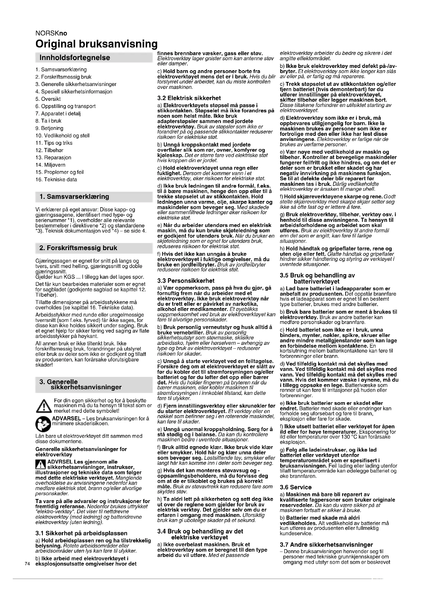 Vi erklærer på eget ansvar: Disse kapp- og gjæringssagene, identifisert med type- og serienummer *1), overholder alle relevante bestemmelser i direktivene *2) og standardene *3). Teknisk dokumentasjon ved *4) – se side 4. Gjæringssagen er egnet for snitt på langs og tvers, snitt med helling, gjæringssnitt og doble gjæringssnitt. Gjelder kun KGS ... I tillegg kan det lages spor. Det får kun bearbeides materialer som er egnet for sagbladet (godkjente sagblad se kapittel 12. Tilbehør). Tillatte dimensjoner på arbeidsstykkene må overholdes (se kapittel 16. Tekniske data). Arbeidsstykker med runde eller uregelmessige tverrsnitt (som f.eks. fyrved) får ikke sages, for disse kan ikke holdes sikkert under saging. Bruk et egnet hjelp for sikker føring ved saging av flate arbeidsstykker på høykant. All annen bruk er ikke tiltenkt bruk. Ikke forskriftsmessig bruk, forandringer på utstyret eller bruk av deler som ikke er godkjent og tillatt av produsenten, kan forårsake uforutsigbare skader! For din egen sikkerhet og for å beskytte maskinen må du ta hensyn til tekst som er merket med dette symbolet! ADVARSEL – Les bruksanvisningen for å minimere skaderisikoen. Lån bare ut elektroverktøyet ditt sammen med disse dokumentene. Generelle sikkerhetsanvisninger for elektroverktøy ADVRSEL Les gjennom alle sikkerhetsanvisninger, instrukser, illustrasjoner og tekniske data som følger med dette elektriske verktøyet. Manglende overholdelse av anvisningene nedenfor kan medføre elektrisk støt, brann og/eller alvorlige personskader. Ta vare på alle advarsler og instruksjoner for fremtidig referanse. Nedenfor brukes uttrykket "elektro-verktøy". Det viser til nettdrevne elektroverktøy (med ledning) og batteridrevne elektroverktøy (uten ledning).