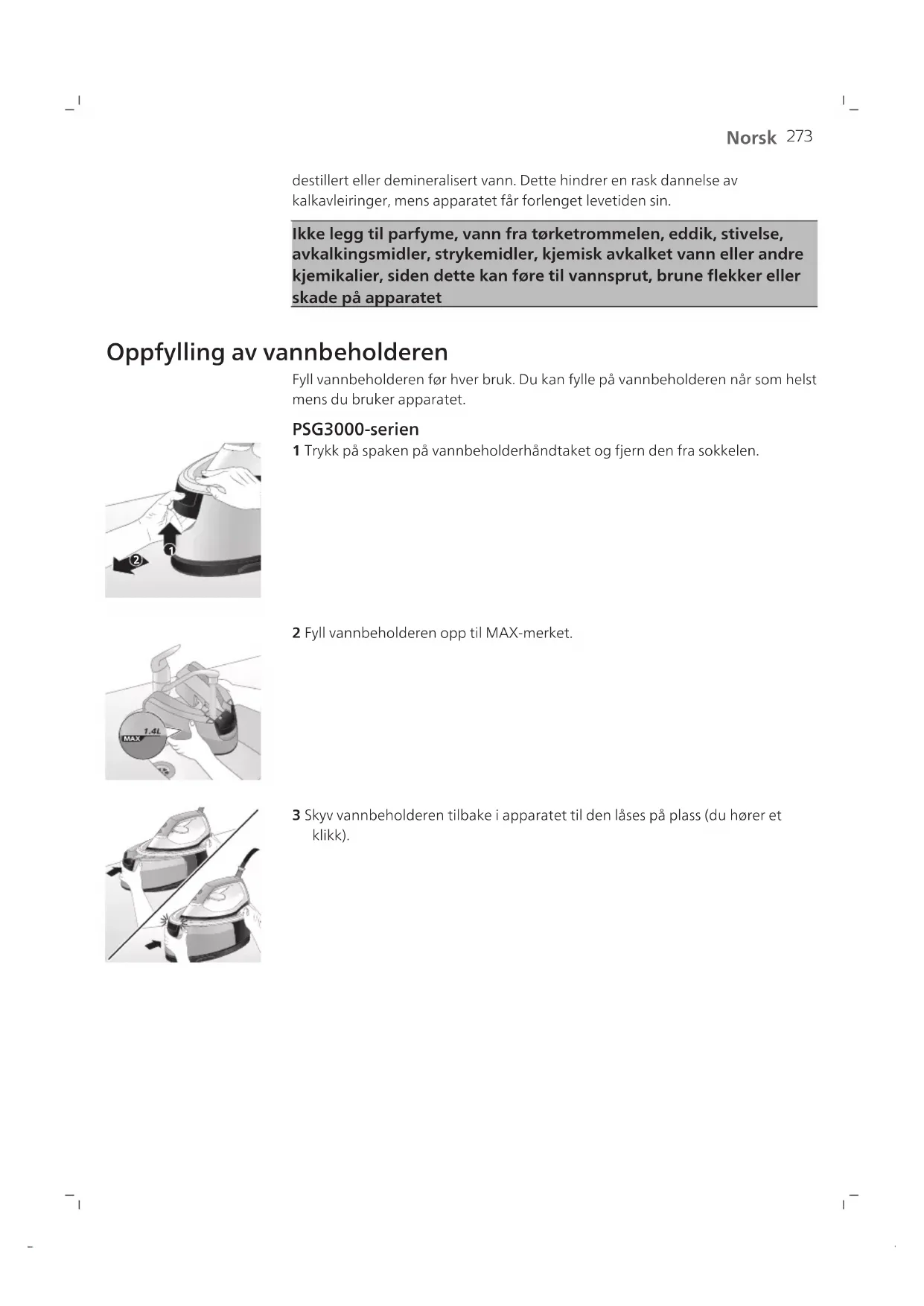 1 Trykk på spaken på vannbeholderhåndtaket og fjern den fra sokkelen. 2 Fyll vannbeholderen opp til MAX-merket. 3 Skyv vannbeholderen tilbake i apparatet til den låses på plass (du hører et klikk).274 Norsk PSG2000-serien 1 Dør for påfylling av vannbeholder må åpnes.2 Fyll vannbeholderen opp til MAX-merket og lukk døren for påfylling avvannbeholder (du hører et klikk). Slik bruker du apparatet Temperaturinnstilling Temperaturinnstilling Automatisk dampinnstilling Stofftype Syntetiske stoffer (f.eks. kunstfiber,akryl, nylon, viskose, polyamid ogpolyester)Silke til MAX Bomull, linECO ECO Alt unntatt syntetiske stoffer275 Norsk Stryking 1 Sett støpselet i en jordet stikkontakt. 2 Trykk på av/på-knappen for å slå på apparatet og vri deretter temperaturbryteren for å stille inn riktig temperatur i henhold til tabellen ovenfor. 3 Det «strykeklare» lyset begynner å blinke for å indikere at apparatet varmes opp. 4 Vent til lampen som indikerer at strykejernet er klart, lyser kontinuerlig. 5 Hvis du vil løsne strykejernet fra strykejernplattformen på PSG3010-modeller, må du trykke på utløserknappen for bærelåsen.276 Norsk 6 Slangen for vanntilførsel skal fjernes fra oppbevaringsrommet. 7 Trykk på og hold inne dampbryteren for å starte strykingen. Merk: Når hver økt starter, kan det sprute vann fra strykejernet. Hvis du vil hindre vannflekker på plagget, må du trykke på dampbryteren i 10sekunder før du begynner å stryke. Merk: Når du starter strykeøkten, og spesielt når du bruker dampbryteren for første gang, kan det ta mer enn 30sekunder før det kommer damp ut av apparatet. Merk: Pumpen aktiveres hver gang du trykker på dampbryteren. Den produserer en svak og raslende lyd. Når det ikke er vann i vannbeholderen, er pumpelyden høyere. Advarsel: Damp skal aldri rettes mot mennesker. Vertikal stryking Hvis du vil fjerne rynker fra opphengte klær, kan du også bruke dampstrykejernet i vertikal stilling. 1 Hold strykejernet i vertikal stilling, trykk på dampbryteren og berør plagget lett med strykesålen. Advarsel: Strykejernet slipper ut varm damp. Hvis noen har på seg plagg med rynker, skal du ikke prøve å fjerne disse. Ikke bruk damp i nærheten av dine egne eller noen andres hender.277 Norsk Dampstøt 1 Dampstøtfunksjonen er bare tilgjengelig fra tre prikker til MAX-temperatur.
