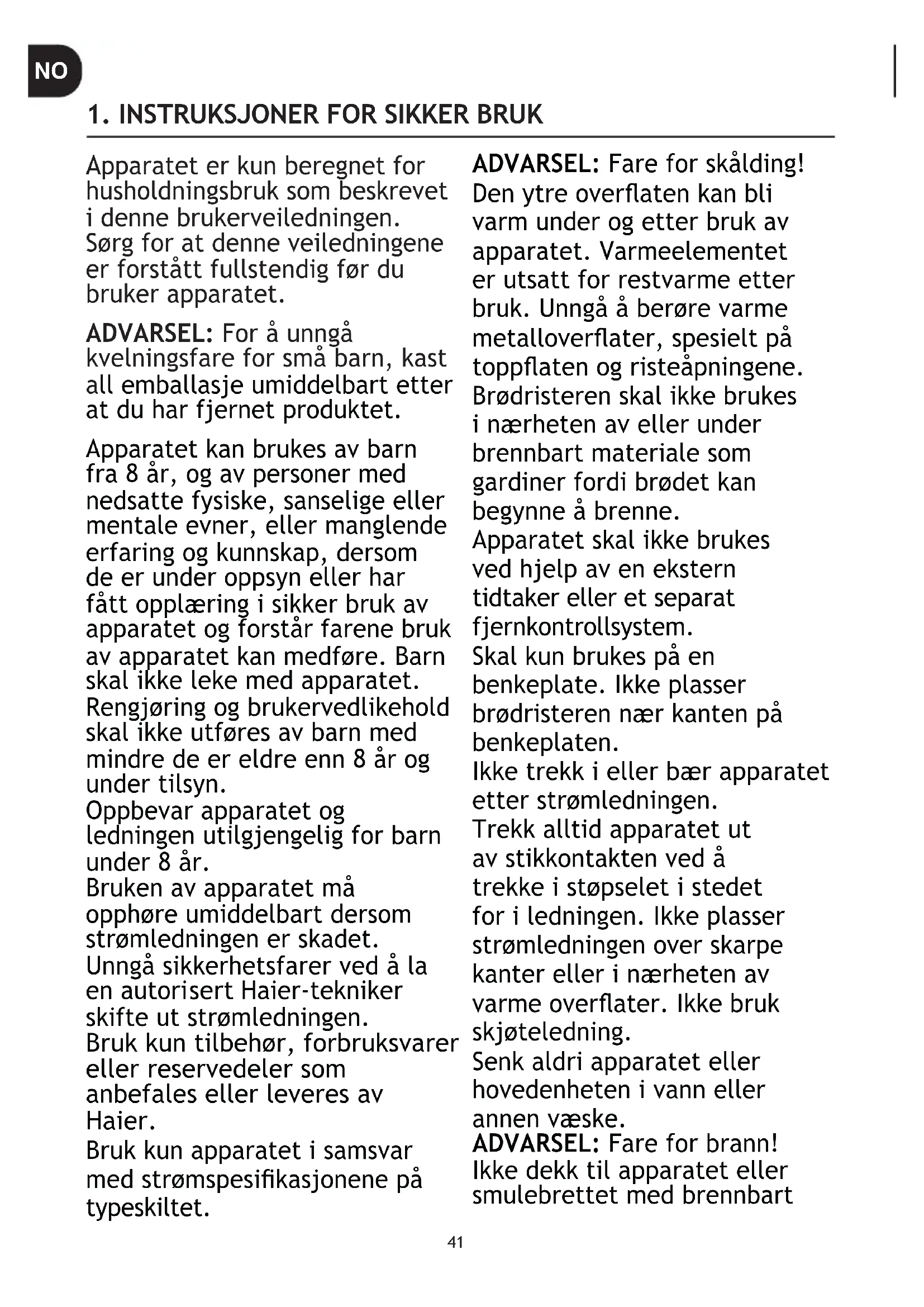 - Løsning: tryk på en vilkårlig knap, eller tryk løftehåndtaget ned.41 Apparatet er kun beregnet for husholdningsbruk som beskrevet i denne brukerveiledningen. Sørg for at denne veiledningene er forstått fullstendig før du bruker apparatet. ADVARSEL: For å unngå kvelningsfare for små barn, kast all emballasje umiddelbart etter at du har fjernet produktet. Apparatet kan brukes av barn fra 8 år, og av personer med nedsatte fysiske, sanselige eller mentale evner, eller manglende erfaring og kunnskap, dersom de er under oppsyn eller har fått opplæring i sikker bruk av apparatet og forstår farene bruk av apparatet kan medføre. Barn skal ikke leke med apparatet. Rengjøring og brukervedlikehold skal ikke utføres av barn med mindre de er eldre enn 8 år og under tilsyn. Oppbevar apparatet og ledningen utilgjengelig for barn under 8 år. Bruken av apparatet må opphøre umiddelbart dersom strømledningen er skadet. Unngå sikkerhetsfarer ved å la en autori sert Haier-tekniker skifte ut strømledningen. Bruk kun tilbehør, forbruksvarer eller reservedeler som anbefales eller leveres av Haier. Bruk kun apparatet i samsvar med strømspesikasjonene på typeskiltet. ADVARSEL: Fare for skålding! Den ytre overaten kan bli varm under og etter bruk av apparatet. Varmeelementet er utsatt for restvarme etter bruk. Unngå å berøre varme metalloverater, spesielt på toppaten og risteåpningene. Brødristeren skal ikke brukes i nærheten av eller under brennbart materiale som gardiner fordi brødet kan begynne å brenne. Apparatet skal ikke brukes ved hjelp av en ekstern tidtaker eller et separat fjernkontrollsystem. Skal kun brukes på en benkeplate. Ikke plasser brødristeren nær kanten på benkeplaten. Ikke trekk i eller bær apparatet etter strømledningen. Trekk alltid apparatet ut av stikkontakten ved å trekke i støpselet i stedet for i ledningen. Ikke plasser strømledningen over skarpe kanter eller i nærheten av varme overater. Ikke bruk skjøteledning. Senk aldri apparatet eller hovedenheten i vann eller annen væske. ADVARSEL: Fare for brann! Ikke dekk til apparatet eller smulebrettet med brennbart