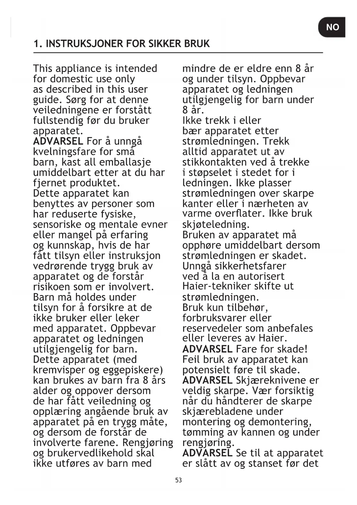 Elektrisk tilslutning 220-240V~50/60Hz Strøm 1000W DK53 This appliance is intended for domestic use only as described in this user guide. Sørg for at denne veiledningene er forstått fullstendig før du bruker apparatet. ADVARSEL For å unngå kvelningsfare for små barn, kast all emballasje umiddelbart etter at du har fjernet produktet. Dette apparatet kan benyttes av personer som har reduserte fysiske, sensoriske og mentale evner eller mangel på erfaring og kunnskap, hvis de har fått tilsyn eller instruksjon vedrørende trygg bruk av apparatet og de forstår risikoen som er involvert. Barn må holdes under tilsyn for å forsikre at de ikke bruker eller leker med apparatet. Oppbevar apparatet og ledningen utilgjengelig for barn. Dette apparatet (med kremvisper og eggepiskere) kan brukes av barn fra 8 års alder og oppover dersom de har fått veiledning og opplæring angående bruk av apparatet på en trygg måte, og dersom de forstår de involverte farene. Rengjøring og brukervedlikehold skal ikke utføres av barn med mindre de er eldre enn 8 år og under tilsyn. Oppbevar apparatet og ledningen utilgjengelig for barn under 8 år. Ikke trekk i eller bær apparatet etter strømledningen. Trekk alltid apparatet ut av stikkontakten ved å trekke i støpselet i stedet for i ledningen. Ikke plasser strømledningen over skarpe kanter eller i nærheten av varme overater. Ikke bruk skjøteledning. Bruken av apparatet må opphøre umiddelbart dersom strømledningen er skadet. Unngå sikkerhetsfarer ved å la en autorisert Haier-tekniker skifte ut strømledningen. Bruk kun tilbehør, forbruksvarer eller reservedeler som anbefales eller leveres av Haier. ADVARSEL Fare for skade! Feil bruk av apparatet kan potensielt føre til skade. ADVARSEL Skjæreknivene er veldig skarpe. Vær forsiktig når du håndterer de skarpe skjærebladene under montering og demontering, tømming av kannen og under rengjøring. ADVARSEL Se til at apparatet er slått av og stanset før det