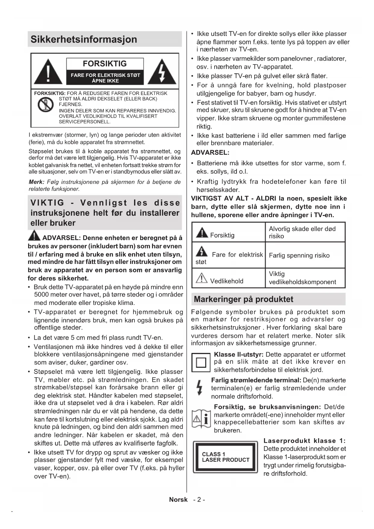 - Kraftig lydtrykk fra hodetelefoner kan føre til hørselsskader. VIKTIGST AV ALT - ALDRI la noen, spesielt ikke barn, dytte eller slå skjermen, dytte noe inn i hullene, sporene eller andre åpninger i TV-en. ForsiktigAlvorlig skade eller død risiko Fare for elektrisk støt Farlig spenning risiko VedlikeholdViktig vedlikeholdskomponent Markeringer på produktet Følgende symboler brukes på produktet som en markør for restriksjoner og advarsler og