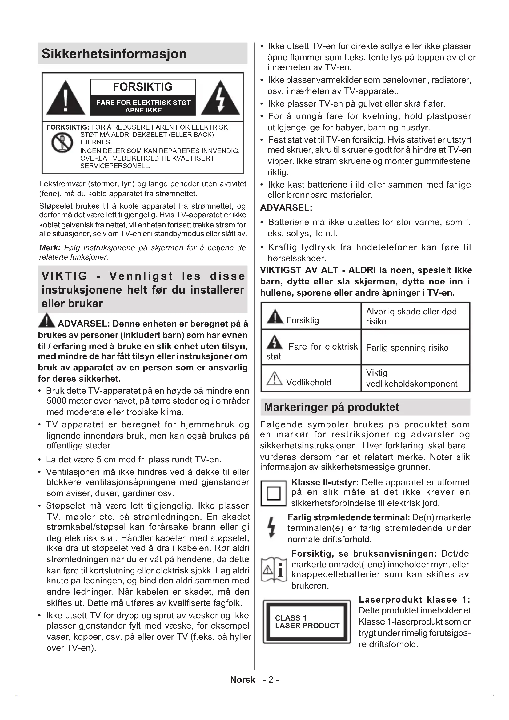 - Udstyret passer kun til montering i højder på ≤ 2m. Hvis ditt eksisterende fjernsynsapparat skal bli be- holdt og yttes, skal du uansette følge instruksjonene ovenfor. – – – – – – – – – – – – Et apparat som er koblet til byggets jordingssystem via strømnettet (eller koblet til et annet apparat som igjen er koblet til jording) og som er koblet til et TV-apparat med en koaksialkabel, kan utgjøre en brannfare. Tilkobling til et TV-fordelingssystem må derfor gjøres gjennom en enhet som tilbyr elektrisk isolasjon under et visst frekvensområde (galvanisk isolator). Advarsler om veggmontasje