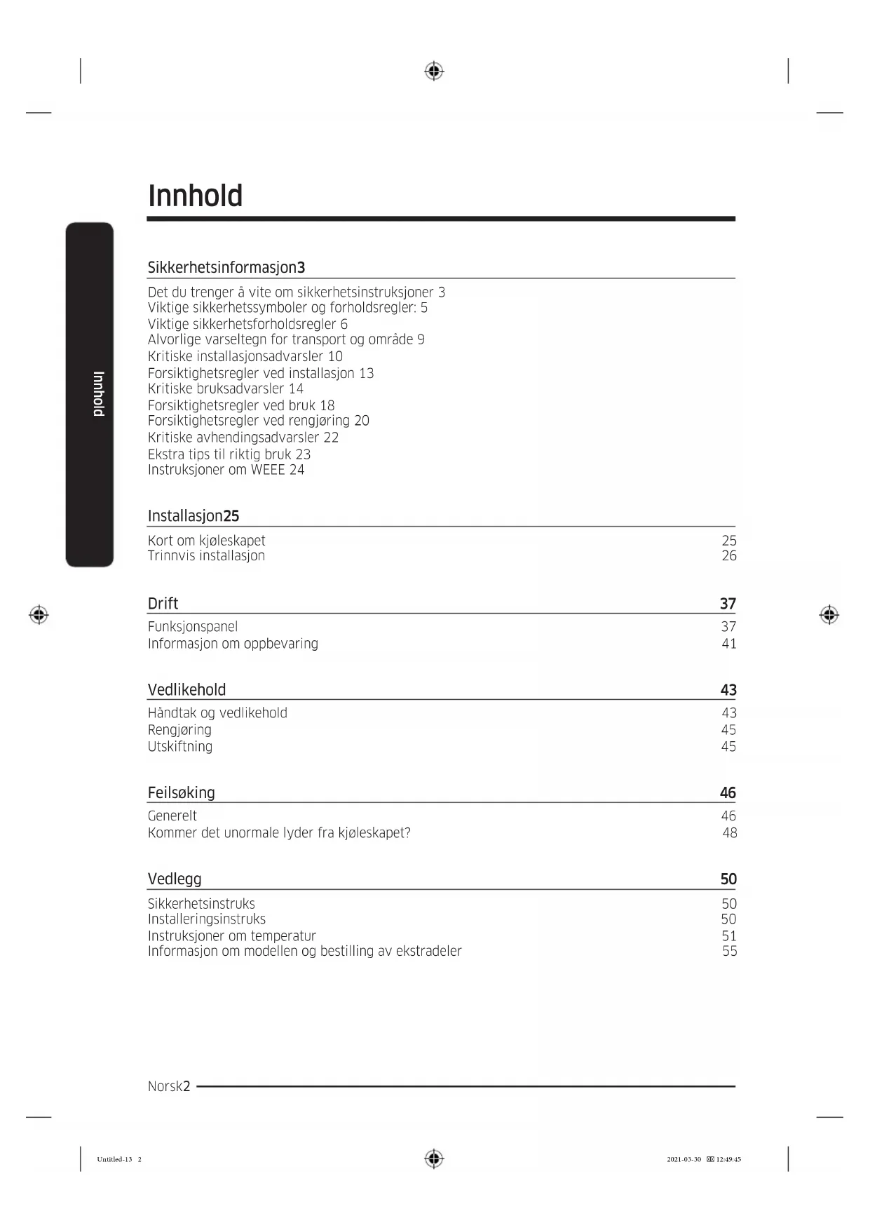 SEB/SEG Innebygd apparat Untitled-13 1 2021-03-30 12:49:45Norsk2 Innhold Innhold Sikkerhetsinformasjon 3 Det du trenger å vite om sikkerhetsinstruksjoner 3 Viktige sikkerhetssymboler og forholdsregler: 5 Viktige sikkerhetsforholdsregler 6 Alvorlige varseltegn for transport og område 9 Kritiske installasjonsadvarsler 10 Forsiktighetsregler ved installasjon 13 Kritiske bruksadvarsler 14 Forsiktighetsregler ved bruk 18 Forsiktighetsregler ved rengjøring 20 Kritiske avhendingsadvarsler 22 Ekstra tips til riktig bruk 23 Instruksjoner om WEEE 24 Installasjon 25 Kort om kjøleskapet 25 Trinnvis installasjon 26 Drift 37 Funksjonspanel 37 Informasjon om oppbevaring 41 Vedlikehold 43 Håndtak og vedlikehold 43 Rengjøring 45 Utskiftning 45 Feilsøking 46 Generelt 46 Kommer det unormale lyder fra kjøleskapet? 48 Vedlegg 50 Sikkerhetsinstruks 50 Installeringsinstruks 50 Instruksjoner om temperatur 51 Informasjon om modellen og bestilling av ekstradeler 55 Untitled-13 2 2021-03-30 12:49:45Norsk 3 Sikkerhetsinformasjon Før du bruker det nye kjøleskapet fra Samsung, leser du denne håndboken nøye slik at du vet hvordan du bruker funksjonene som apparatet tilbyr på en trygg og effektiv måte. Det du trenger å vite om sikkerhetsinstruksjoner