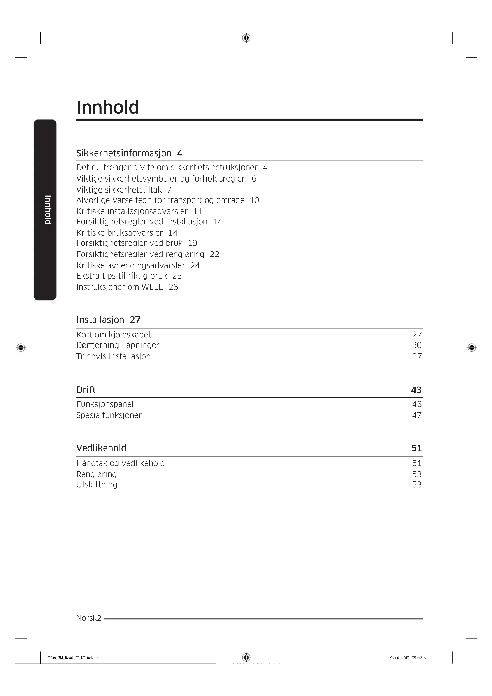 Chamada para a rede fixa nacional Dias úteis das 9h às 20h www.samsung.com/pt/support SPAIN 91 175 00 15 www.samsung.com/es/support FRANCE 01 48 63 00 00 www.samsung.com/fr/support NORWAY 21629099 www.samsung.com/no/support DENMARK 707 019 70 www.samsung.com/dk/support FINLAND 030-6227 515 www.samsung.com/fi/support SWEDEN 0771-400 300 www.samsung.com/se/support RF48_UM_Rev00_EF RF48_UM_Rev00_EF_DA.indd 68 2023-03-28() 3:50:41Kjøleskap Brukerhåndbok RF48A40**** Frittstående apparat RF48_UM_Rev00_EF_NO.indd 1 2023-03-28() 3:48:22Innhold Norsk2 Innhold Sikkerhetsinformasjon 4 Det du trenger å vite om sikkerhetsinstruksjoner 4 Viktige sikkerhetssymboler og forholdsregler: 6 Viktige sikkerhetstiltak 7 Alvorlige varseltegn for transport og område 10 Kritiske installasjonsadvarsler 11 Forsiktighetsregler ved installasjon 14 Kritiske bruksadvarsler 14 Forsiktighetsregler ved bruk 19 Forsiktighetsregler ved rengjøring 22 Kritiske avhendingsadvarsler 24 Ekstra tips til riktig bruk 25 Instruksjoner om WEEE 26 Installasjon 27 Kort om kjøleskapet 27 Dørerning i åpninger 30 Trinnvis installasjon 37 Drift 43 Funksjonspanel 43 Spesialfunksjoner 47 Vedlikehold 51 Håndtak og vedlikehold 51 Rengjøring 53 Utskiftning 53 RF48_UM_Rev00_EF_NO.indd 2 2023-03-28() 3:48:22Innhold Norsk 3 Feilsøking 54 Generelt 54 Kommer det unormale lyder fra kjøleskapet? 56 Vedlegg 58 Sikkerhetsinstruks 58 Installeringsinstruks 58 Instruksjoner om temperatur 59 Informasjon om modellen og bestilling av ekstradeler 63 RF48_UM_Rev00_EF_NO.indd 3 2023-03-28() 3:48:22Sikkerhetsinformasjon Norsk4 Sikkerhetsinformasjon Før du bruker det nye kjøleskapet fra Samsung, leser du denne håndboken nøye slik at du vet hvordan du bruker funksjonene som apparatet tilbyr på en trygg og effektiv måte. Det du trenger å vite om sikkerhetsinstruksjoner