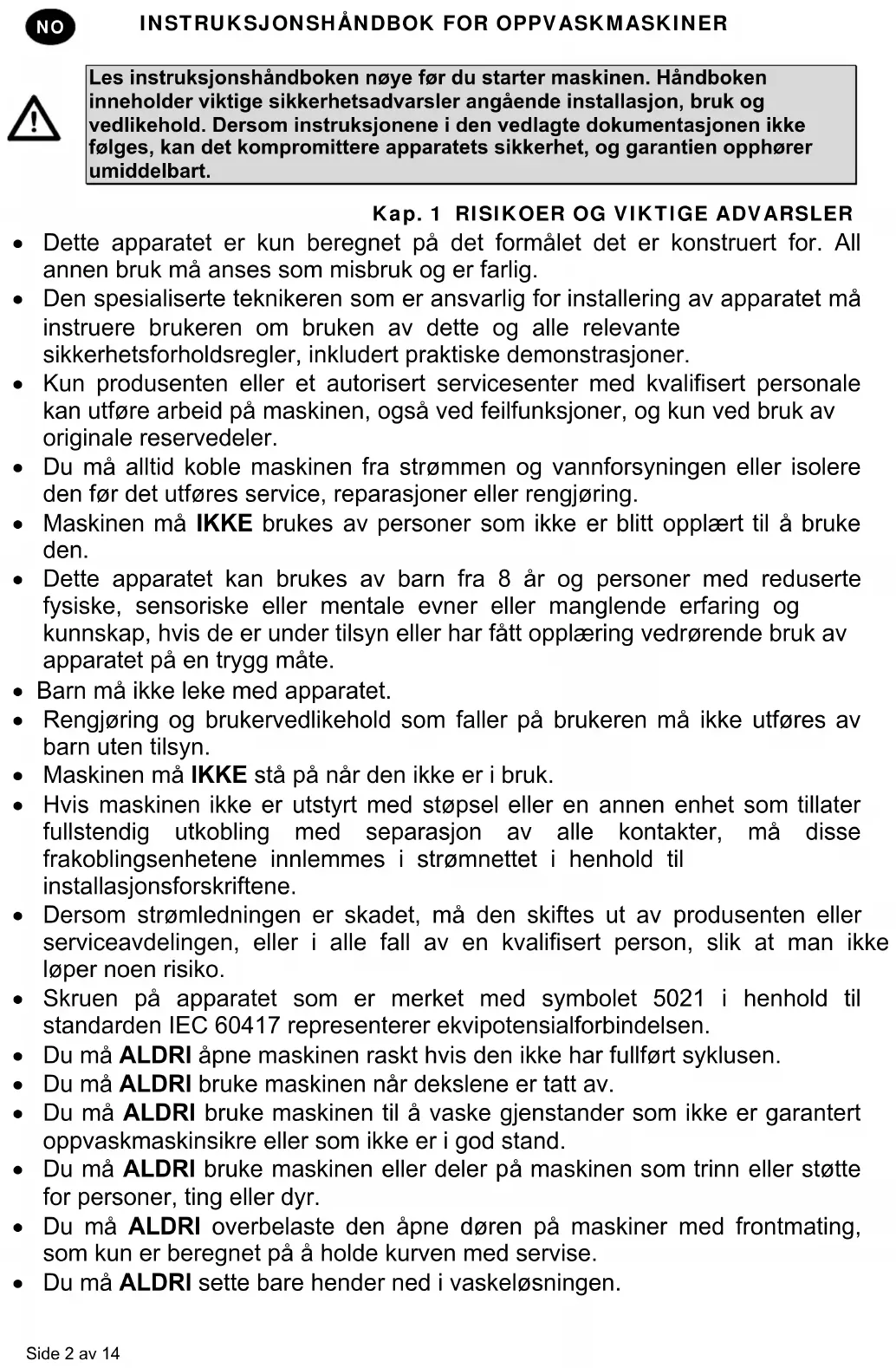 Dette apparatet er kun beregnet på det formålet det er konstruert for. All annen bruk må anses som misbruk og er farlig. Den spesialiserte teknikeren som er ansvarlig for installering av apparatet må instruere brukeren om bruken av dette og alle relevante sikkerhetsforholdsregler, inkludert praktiske demonstrasjoner. Kun produsenten eller et autorisert servicesenter med kvalifisert personale kan utføre arbeid på maskinen, også ved feilfunksjoner, og kun ved bruk av originale reservedeler. Du må alltid koble maskinen fra strømmen og vannforsyningen eller isolere den før det utføres service, reparasjoner eller rengjøring. Maskinen må IKKE brukes av personer som ikke er blitt opplært til å bruke den. Dette apparatet kan brukes av barn fra 8 år og personer med reduserte fysiske, sensoriske eller mentale evner eller manglende erfaring og kunnskap, hvis de er under tilsyn eller har fått opplæring vedrørende bruk av apparatet på en trygg måte. Barn må ikke leke med apparatet. Rengjøring og brukervedlikehold som faller på brukeren må ikke utføres av barn uten tilsyn. Maskinen må IKKE stå på når den ikke er i bruk. Hvis maskinen ikke er utstyrt med støpsel eller en annen enhet som tillater fullstendig utkobling med separasjon av alle kontakter, må disse frakoblingsenhetene innlemmes i strømnettet i henhold til installasjonsforskriftene. Dersom strømledningen er skadet, må den skiftes ut av produsenten eller serviceavdelingen, eller i alle fall av en kvalifisert person, slik at man ikke løper noen risiko. Skruen på apparatet som er merket med symbolet 5021 i henhold til standarden IEC 60417 representerer ekvipotensialforbindelsen. Du må ALDRI åpne maskinen raskt hvis den ikke har fullført syklusen. Du må ALDRI bruke maskinen når dekslene er tatt av. Du må ALDRI bruke maskinen til å vaske gjenstander som ikke er garantert oppvaskmaskinsikre eller som ikke er i god stand. Du må ALDRI bruke maskinen eller deler på maskinen som trinn eller støtte for personer, ting eller dyr. Du må ALDRI overbelaste den åpne døren på maskiner med frontmating, som kun er beregnet på å holde kurven med servise. Du må ALDRI sette bare hender ned i vaskeløsningen.INSTRUKSJONSHÅNDBOK FOR OPPVASKMASKINER Side 3 av 14