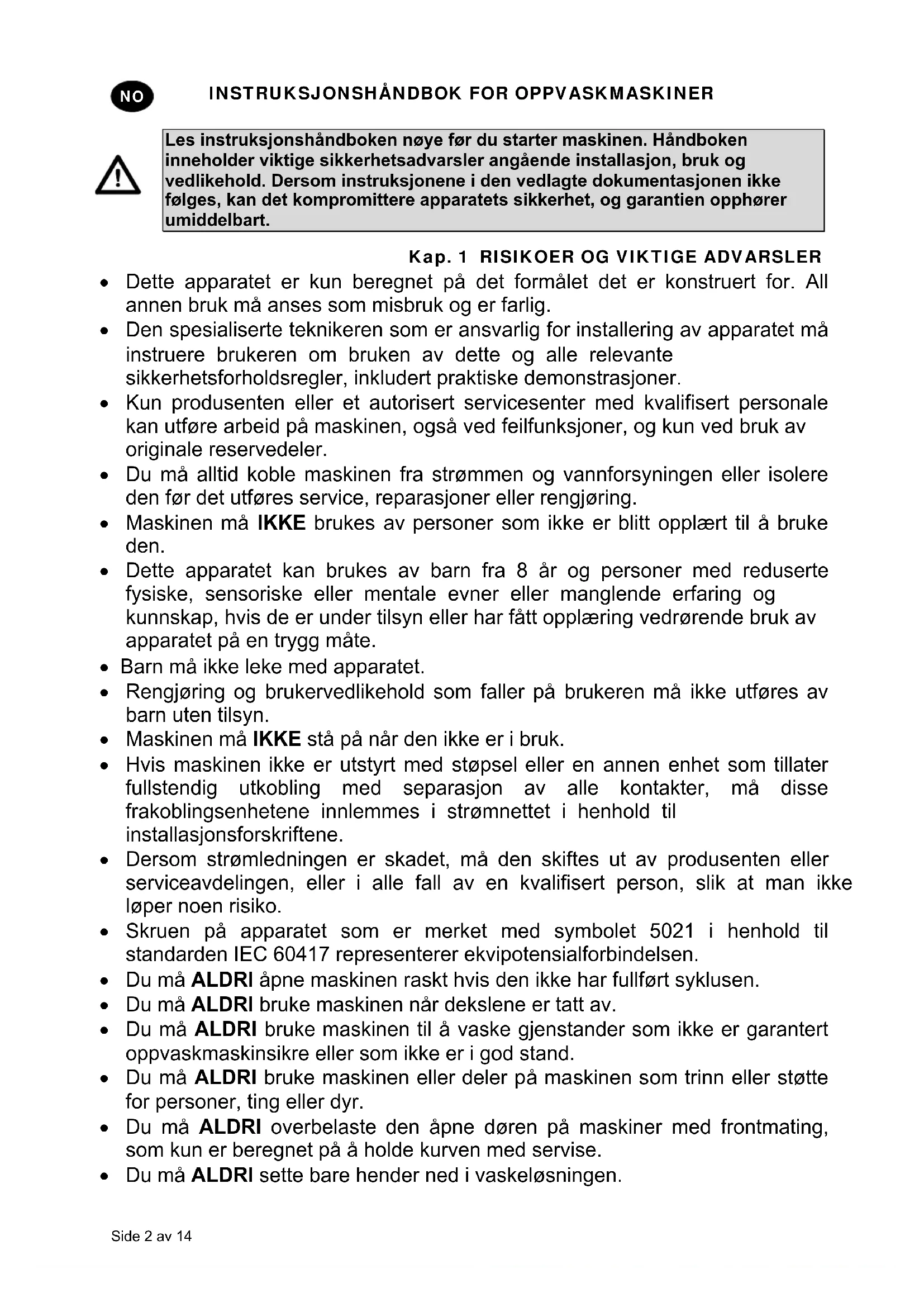 Dette apparatet er kun beregnet på det formålet det er konstruert for. All annen bruk må anses som misbruk og er farlig. Den spesialiserte teknikeren som er ansvarlig for installering av apparatet må instruere brukeren om bruken av dette og alle relevante sikkerhetsforholdsregler, inkludert praktiske demonstrasjoner. Kun produsenten eller et autorisert servicesenter med kvalifisert personale kan utføre arbeid på maskinen, også ved feilfunksjoner, og kun ved bruk av originale reservedeler. Du må alltid koble maskinen fra strømmen og vannforsyningen eller isolere den før det utføres service, reparasjoner eller rengjøring. Maskinen må IKKE brukes av personer som ikke er blitt opplært til å bruke den. Dette apparatet kan brukes av barn fra 8 år og personer med reduserte fysiske, sensoriske eller mentale evner eller manglende erfaring og kunnskap, hvis de er under tilsyn eller har fått opplæring vedrørende bruk av apparatet på en trygg måte. Barn må ikke leke med apparatet. Rengjøring og brukervedlikehold som faller på brukeren må ikke utføres av barn uten tilsyn. Maskinen må IKKE stå på når den ikke er i bruk. Hvis maskinen ikke er utstyrt med støpsel eller en annen enhet som tillater fullstendig utkobling med separasjon av alle kontakter, må disse frakoblingsenhetene innlemmes i strømnettet i henhold til installasjonsforskriftene. Dersom strømledningen er skadet, må den skiftes ut av produsenten eller serviceavdelingen, eller i alle fall av en kvalifisert person, slik at man ikke løper noen risiko. Skruen på apparatet som er merket med symbolet 5021 i henhold til standarden IEC 60417 representerer ekvipotensialforbindelsen. Du må ALDRI åpne maskinen raskt hvis den ikke har fullført syklusen. Du må ALDRI bruke maskinen når dekslene er tatt av. Du må ALDRI bruke maskinen til å vaske gjenstander som ikke er garantert oppvaskmaskinsikre eller som ikke er i god stand. Du må ALDRI bruke maskinen eller deler på maskinen som trinn eller støtte for personer, ting eller dyr. Du må ALDRI overbelaste den åpne døren på maskiner med frontmating, som kun er beregnet på å holde kurven med servise. Du må ALDRI sette bare hender ned i vaskeløsningen.INSTRUKSJONSHÅNDBOK FOR OPPVASKMASKINER Side 3 av 14