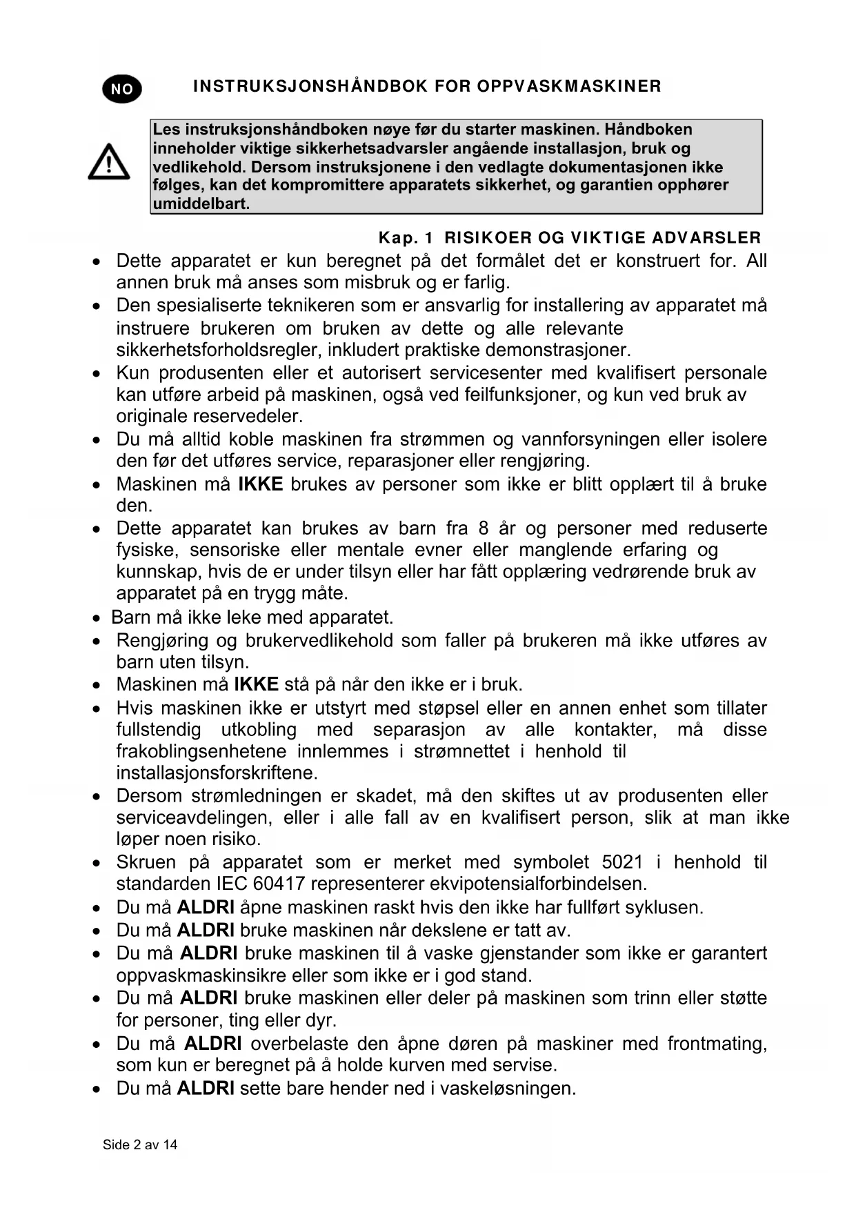 Dette apparatet er kun beregnet på det formålet det er konstruert for. All annen bruk må anses som misbruk og er farlig. Den spesialiserte teknikeren som er ansvarlig for installering av apparatet må instruere brukeren om bruken av dette og alle relevante sikkerhetsforholdsregler, inkludert praktiske demonstrasjoner. Kun produsenten eller et autorisert servicesenter med kvalifisert personale kan utføre arbeid på maskinen, også ved feilfunksjoner, og kun ved bruk av originale reservedeler. Du må alltid koble maskinen fra strømmen og vannforsyningen eller isolere den før det utføres service, reparasjoner eller rengjøring. Maskinen må IKKE brukes av personer som ikke er blitt opplært til å bruke den. Dette apparatet kan brukes av barn fra 8 år og personer med reduserte fysiske, sensoriske eller mentale evner eller manglende erfaring og kunnskap, hvis de er under tilsyn eller har fått opplæring vedrørende bruk av apparatet på en trygg måte. Barn må ikke leke med apparatet. Rengjøring og brukervedlikehold som faller på brukeren må ikke utføres av barn uten tilsyn. Maskinen må IKKE stå på når den ikke er i bruk. Hvis maskinen ikke er utstyrt med støpsel eller en annen enhet som tillater fullstendig utkobling med separasjon av alle kontakter, må disse frakoblingsenhetene innlemmes i strømnettet i henhold til installasjonsforskriftene. Dersom strømledningen er skadet, må den skiftes ut av produsenten eller serviceavdelingen, eller i alle fall av en kvalifisert person, slik at man ikke løper noen risiko. Skruen på apparatet som er merket med symbolet 5021 i henhold til standarden IEC 60417 representerer ekvipotensialforbindelsen. Du må ALDRI åpne maskinen raskt hvis den ikke har fullført syklusen. Du må ALDRI bruke maskinen når dekslene er tatt av. Du må ALDRI bruke maskinen til å vaske gjenstander som ikke er garantert oppvaskmaskinsikre eller som ikke er i god stand. Du må ALDRI bruke maskinen eller deler på maskinen som trinn eller støtte for personer, ting eller dyr. Du må ALDRI overbelaste den åpne døren på maskiner med frontmating, som kun er beregnet på å holde kurven med servise. Du må ALDRI sette bare hender ned i vaskeløsningen.INSTRUKSJONSHÅNDBOK FOR OPPVASKMASKINER Side 3 av 14