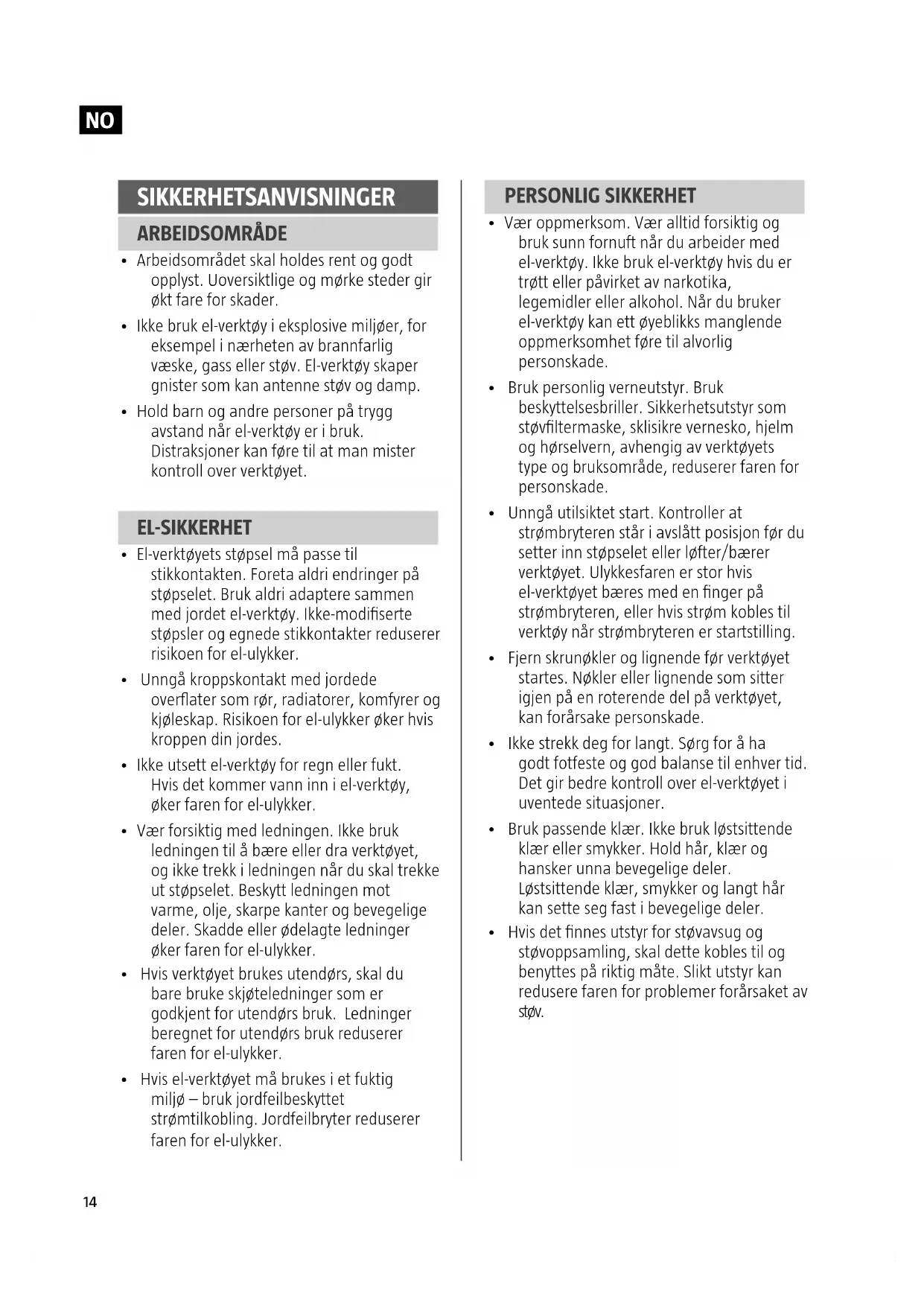 - Hvis el-verktøyet må brukes i et fuktig miljø – bruk jordfeilbeskyttet strømtilkobling. Jordfeilbryter reduserer faren for el-ulykker.NO