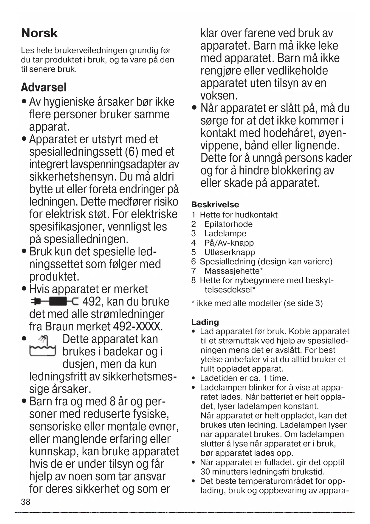 - Tynne, gjenvokste hår vokser kanskje ikke opp til hudoverflaten. Eksfoliering hjelper til å forhindre inngrodde hår ved å skrubbe av eller fjerne det ytterste hudlaget slik at fine hår kan trenge gjennom hudoverflaten. Rengjøring av epileringshodet Regelmessig rengjøring av epileringsho- det sikrer god hygiene. Fjern først hetten som er brukt (1, 7 eller 8) og skyll den under rennende vann. Epileringshodet fjernes ved å trykke på utløserknappen (5). Tørr: Rengjør pinsettelementet grundig ved å bruke rengjøringsbørsten. Våt: Etter hver våt bruk (spesielt med gel), rengjøres epileringshodet under rennende vann. Under rengjøringen skal epilatoren slås på i noen få sekunder. Ikke sett på igjen en hette før epileringshodet er helt tørt. Generell informasjon om epilering Alle metoder som fjerner hår fra roten kan føre til inngrodde hår og hudirritasjon (f.eks. kløe, ubehag eller rødflammet hud), avhengig av hudens og hårets tilstand. Dette er normale reaksjoner som bør forsvinne raskt, men som kan være krafti- gere når du fjerner hår ved roten for første gang eller hvis du har sensitiv hud. Hvis huden din fortsatt er irritert etter ca. 36 timer, anbefaler vi at du kontakter lege. Vanligvis reduseres hudreaksjonen og ubehagsfølelsen vesentlig ved gjentatt bruk av Silk·épil. I enkelte tilfeller kan det oppstå betennelse i huden hvis bakterier trenger inn i huden (f.eks. når apparatet berører huden). Grundig rengjøring av epilatorhodet før hver bruk vil redusere faren for infeksjon. Kontakt lege om du er usikker på om du kan bruke dette apparatet. I følgende tilfeller må apparatet bare brukes etter konsultasjon med lege: ved eksem, sår, betennelsestilstander i huden, som folli- kulitt (hårsekkbetennelse) og åreknuter rundt føflekker, ved redusert immunitet i huden, f.eks. pga diabetes, graviditet, Raynauds sykdom, blødersykdom, can- dida eller immunsvikt. Miljømessige opplysninger Dette produktet inneholder batterier og resirkulerbart elektronisk avfall. Av miljøhensyn bør ikke dette pro- duktet kastes sammen med hus- holdningsavfall, men leveres til et lokalt returpunkt. Med forbehold om endringer. Garanti Vi gir 2 års garanti på produktet gjeldende fra kjøpsdato. I garantitiden vil vi gratis rette eventuelle fabrikasjons- eller materialfeil, enten ved reparasjon eller om vi finner det hensikts- messig å bytte hele produktet. Denne garanti er gyldig i alle land der Braun eller Brauns distributør selger produktet. Denne garanti dekker ikke: skader på grunn av feil bruk, normal slitasje eller skader som har ubetydelig effekt på pro- duktets verdi og virkemåte. Garantien bortfaller dersom reparasjoner utføres av ikke autorisert person eller hvis andre enn originale Braun reservedeler benyttes. For service i garantitiden skal hele pro- duktet leveres eller sendes sammen med kopi av kjøpskvittering til nærmeste autoriserte Braun Serviceverksted: www.service.braun.com. Ring 22 63 00 93 for å bli henvist til nær- meste autoriserte Braun Serviceverksted.
