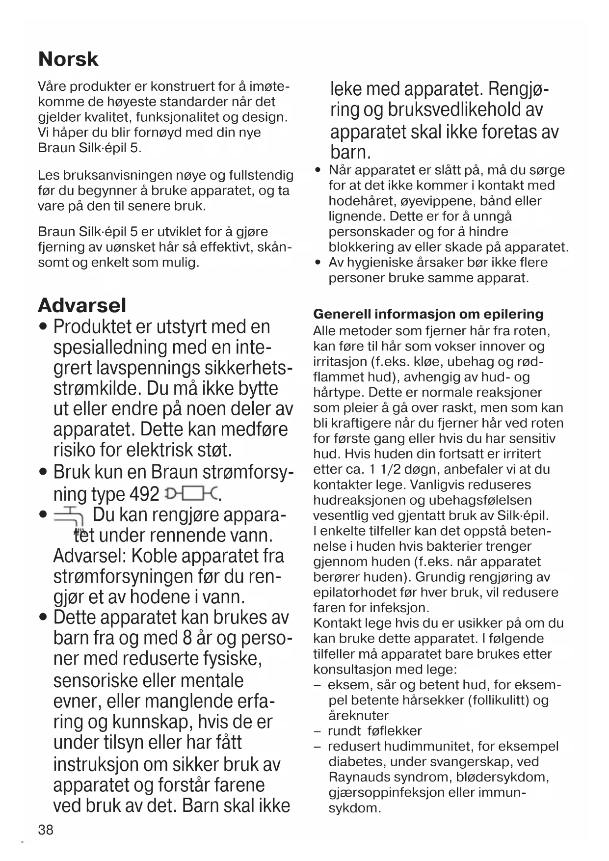 Dette apparatet kan brukes av barn fra og med 8 år og perso- ner med reduserte fysiske, sensoriske eller mentale evner, eller manglende erfa- ring og kunnskap, hvis de er under tilsyn eller har fått instruksjon om sikker bruk av apparatet og forstår farene ved bruk av det. Barn skal ikke leke med apparatet. Rengjø- ring og bruksvedlikehold av apparatet skal ikke foretas av barn.