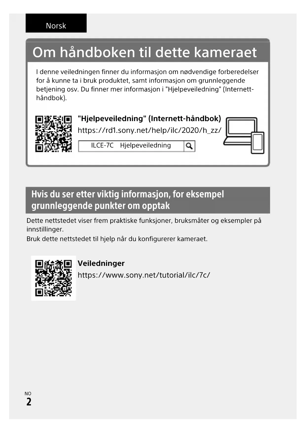 C:\0708\5021708411ILCE7CCEC\13NO-ILCE7CCEC\13NO.indd DTP data saved: 2020/06/26 09:51 PDF file created: 2020/07/08 09:15 Norsk Om håndboken til dette kameraet I denne veiledningen finner du informasjon om nødvendige forberedelser for å kunne ta i bruk produktet, samt informasjon om grunnleggende betjening osv. Du finner mer informasjon i "Hjelpeveiledning" (Internett-håndbok). https://rd1.sony.net/help/ilc/2020/h_zz/ "Hjelpeveiledning" (Internett-håndbok) ILCE-7C Hjelpeveiledning Hvis du ser etter viktig informasjon, for eksempel grunnleggende punkter om opptak Dette nettstedet viser frem praktiske funksjoner, bruksmåter og eksempler på innstillinger.Bruk dette nettstedet til hjelp når du konfigurerer kameraet. Veiledninger https://www.sony.net/tutorial/ilc/7c/ILCE-7C5-021-708-41(1)