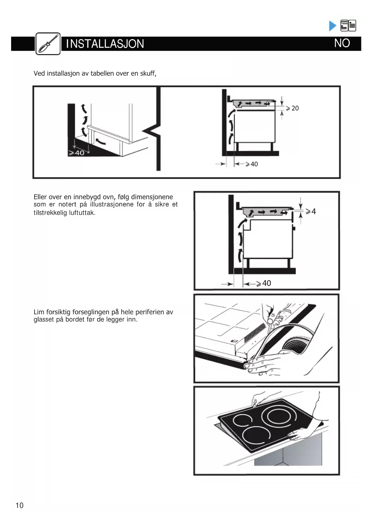 INSTALLASJON UTPAKKINGFor fremtidig bruk, fjern alle beskyttende elemen-ter. Kontroller og følg egenskapene til enheten på merkeskiltet.Vær oppmerksom på rammene under service og standard referanse referanser på denne platen.INNFELTKontroller at oppføringene og luftutgangene er klare.Tenk på indikasjoner på de forsenkede di-mensjonene (millimeter) på benkeplaten som er ment å motta koketoppen. Kontroller at luften sirkulerer riktig mellom forsiden og baksiden av koketoppen din. SERV