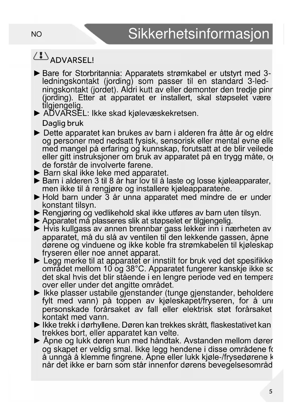 ADVARSEL! ► Bare for Storbritannia: Apparatets strømkabel er utstyrt med 3- ledningskontakt (jording) som passer til en standard 3-led- ningskontakt (jordet). Aldri kutt av eller demonter den tredje pinnen (jording). Etter at apparatet er installert, skal støpselet være tilgjengelig. ► ADVARSEL: Ikke skad kjølevæskekretsen. Daglig bruk ► Dette apparatet kan brukes av barn i alderen fra åtte år og eldre og personer med nedsatt fysisk, sensorisk eller mental evne eller med mangel på erfaring og kunnskap, forutsatt at de blir veiledet eller gitt instruksjoner om bruk av apparatet på en trygg måte, og de forstår de involverte farene. ► Barn skal ikke leke med apparatet. ► Barn i alderen 3 til 8 år har lov til å laste og losse kjøleapparater, men ikke til å rengjøre og installere kjøleapparatene. ► Hold barn under 3 år unna apparatet med mindre de er under konstant tilsyn. ► Rengjøring og vedlikehold skal ikke utføres av barn uten tilsyn. ► Apparatet må plasseres slik at støpselet er tilgjengelig. ► Hvis kullgass av annen brennbar gass lekker inn i nærheten av apparatet, må du slå av ventilen til den lekkende gassen, åpne dørene og vinduene og ikke koble fra strømkabelen til kjøleskapet/ fryseren eller noe annet apparat. ► Legg merke til at apparatet er innstilt for bruk ved det spesifikke området mellom 10 og 38°C. Apparatet fungerer kanskje ikke som det skal hvis det blir stående i en lengre periode ved en temperatur over eller under det angitte området. ► Ikke plasser ustabile gjenstander (tunge gjenstander, beholdere fylt med vann) på toppen av kjøleskapet/fryseren, for å unngå personskade forårsaket av fall eller elektrisk støt forårsaket av kontakt med vann. ► Ikke trekk i dørhyllene. Døren kan trekkes skrått, flaskestativet kan trekkes bort, eller apparatet kan velte. ► Åpne og lukk døren kun med håndtak. Avstanden mellom døren og skapet er veldig smal. Ikke legg hendene i disse områdene for å unngå å klemme fingrene. Åpne eller lukk kjøle-/frysedørene kun når det ikke er barn som står innenfor dørens bevegelsesområde.Sikkerhetsinformasjon