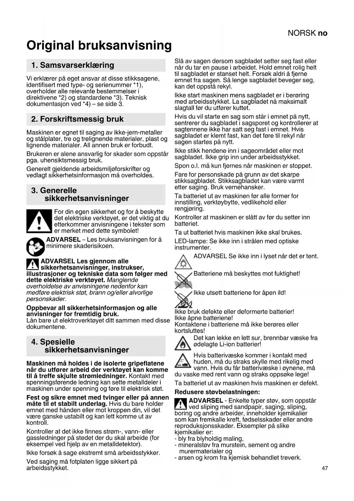Original bruksanvisning Vi erklærer på eget ansvar at disse stikksagene, identifisert med type- og serienummer *1), overholder alle relevante bestemmelser i direktivene *2) og standardene *3). Teknisk dokumentasjon ved *4) – se side 3. Maskinen er egnet til saging av ikke-jern-metaller og stålplater, tre og trelignende materialer, plast og lignende materialer. All annen bruk er forbudt. Brukeren er alene ansvarlig for skader som oppstår pga. uhensiktsmessig bruk. Generelt gjeldende arbeidsmiljøforskrifter og vedlagt sikkerhetsinformasjon må overholdes. For din egen sikkerhet og for å beskytte det elektriske verktøyet, er det viktig at du etterkommer anvisningene i tekster som er merket med dette symbolet! ADVARSEL – Les bruksanvisningen for å minimere skaderisikoen. ADVARSEL Les gjennom alle sikkerhetsanvisninger, instrukser, illustrasjoner og tekniske data som følger med dette elektriske verktøyet. Manglende overholdelse av anvisningene nedenfor kan medføre elektrisk støt, brann og/eller alvorlige personskader. Oppbevar all sikkerhetsinformasjon og alle anvisninger for fremtidig bruk. Lån bare ut elektroverktøyet ditt sammen med disse dokumentene. Maskinen må holdes i de isolerte gripeflatene når du utfører arbeid der verktøyet kan komme til å treffe skjulte strømledninger. Kontakt med spenningsførende ledning kan sette metalldeler i maskinen under spenning og føre til elektrisk støt. Fest og sikre emnet med tvinger eller på annen måte til et stabilt underlag. Hvis du bare holder emnet med hånden eller mot kroppen din, vil det være ganske ustabilt og kan lett komme ut av kontroll. Kontroller at det ikke finnes strøm-, vann- eller gassledninger på stedet der du skal arbeide (for eksempel ved hjelp av en metalldetektor). Ikke forsøk å sage ekstremt små arbeidsstykker. Ved saging må fotplaten ligge sikkert på arbeidsstykket. Slå av sagen dersom sagbladet setter seg fast eller når du tar en pause i arbeidet. Hold emnet rolig helt til sagbladet er stanset helt. Forsøk aldri å fjerne emnet fra sagen. Så lenge sagbladet beveger seg, kan det oppstå rekyl. Ikke start maskinen mens sagbladet er i berøring med arbeidsstykket. La sagbladet nå maksimalt slagtall før du utfører kuttet. Hvis du vil starte en sag som står i emnet på nytt, sentrerer du sagbladet i sagsporet og kontrollerer at sagtennene ikke har satt seg fast i emnet. Hvis sagbladet er klemt fast, kan det føre til rekyl når sagen startes på nytt. Ikke stikk hendene inn i sageområdet eller mot sagbladet. Ikke grip inn under arbeidsstykket. Spon o.l. må kun fjernes når maskinen er stoppet. Fare for personskade på grunn av det skarpe stikksagbladet. Stikksagbladet kan være varmt etter saging. Bruk vernehansker. Ta batteriet ut av maskinen før alle former for innstilling, verktøybytte, vedlikehold eller rengjøring. Kontroller at maskinen er slått av før du setter inn batteriet. Ta ut batteriet hvis maskinen ikke skal brukes. LED-lampe: Se ikke inn i strålen med optiske instrumenter. ADVARSEL Se ikke inn i lyset når det er tent. Batteriene må beskyttes mot fuktighet! Ikke utsett batteriene for åpen ild! Ikke bruk defekte eller deformerte batterier! Ikke åpne batteriene! Kontaktene i batteriene må ikke berøres eller kortsluttes! Det kan lekke en lett sur, brennbar væske fra ødelagte Li-ion batterier! Hvis batterivæske kommer i kontakt med huden, må du straks skylle med rikelig med vann. Hvis du får batterivæske i øynene, må du vaske med rent vann og straks oppsøke lege! Ta batteriet ut av maskinen hvis maskinen er defekt. Redusere støvbelastningen: ADVARSEL - Enkelte typer støv, som oppstår ved sliping med sandpapir, saging, sliping, boring og andre arbeider, inneholder kjemikalier som kan fremkalle kreft, fødselsskader eller andre reproduksjonsskader. Eksempler på slike kjemikalier er: - bly fra blyholdig maling, - mineralstøv fra murstein, sement og andre murermaterialer og - arsen og krom fra kjemisk behandlet treverk.