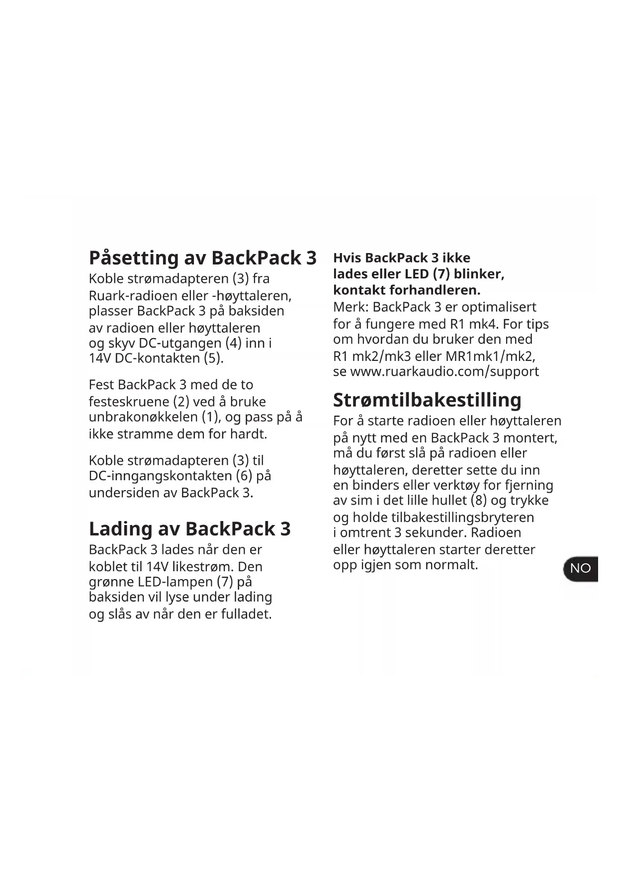 Påsetting av BackPack 3 Koble strømadapteren (3) fra Ruark-radioen eller -høyttaleren, plasser BackPack 3 på baksiden av radioen eller høyttaleren og skyv DC-utgangen (4) inn i 14V DC-kontakten (5). Fest BackPack 3 med de to festeskruene (2) ved å bruke unbrakonøkkelen (1), og pass på å ikke stramme dem for hardt. Koble strømadapteren (3) til DC-inngangskontakten (6) på undersiden av BackPack 3. Lading av BackPack 3 BackPack 3 lades når den er koblet til 14V likestrøm. Den grønne LED-lampen (7) på baksiden vil lyse under lading og slås av når den er fulladet. Hvis BackPack 3 ikke lades eller LED (7) blinker, kontakt forhandleren. Merk: BackPack 3 er optimalisert for å fungere med R1 mk4. For tips om hvordan du bruker den med R1 mk2/mk3 eller MR1mk1/mk2, se www.ruarkaudio.com/support Strømtilbakestilling For å starte radioen eller høyttaleren på nytt med en BackPack 3 montert, må du først slå på radioen eller høyttaleren, deretter sette du inn en binders eller verktøy for fjerning av sim i det lille hullet (8) og trykke og holde tilbakestillingsbryteren i omtrent 3 sekunder. Radioen eller høyttaleren starter deretter opp igjen som normalt.Sikkerhetsinformasjon INNEHOLDER LITIUM ION-CELLER ● Du må aldri, av noen grunner, forsøke å åpne batteripakken. Hvis esken til batteripakken har sprukket eller er skadet, må du ikke feste den til en radio eller høyttaler. Ikke klem, slipp ned eller skad batteripakken. Ikke bruk en batteripakke som har blitt sluppet ned eller skadet på noen måte. Skadde batteripakker må sendes til et servicesenter eller resirkulert. ● Batteripakken må ikke forbrennes selv om den er svært skadd eller helt utslitt. ● Hvis innholdet i batteriet kommer i kontakt med huden, må området straks vaskes i mildt såpevann. ● Les denne bruksanvisningen og følg alle instruksjonene. Det hvil hjelpe deg å sette opp og bruke produktet riktig. ● Vær oppmerksom på alle advarsler og ta vare på denne bruksanvisningen som fremtidig referanse. ● Henvis alt servicearbeid til kvalisert personell. ● Denne enheten er BARE ment brukt med AC-spenninger som er oppført på enheten eller med strømforsyningen som er inkludert. Bruk med spenninger enn dem som er angitt kan forårsake irreversibel skade på enheten, og tilsidesette produktgarantien. ● Bare bruk den medfølgende strømforsyningen med original Ruark radio eller høyttalere, eller bruk et godkjent alternativ.EN