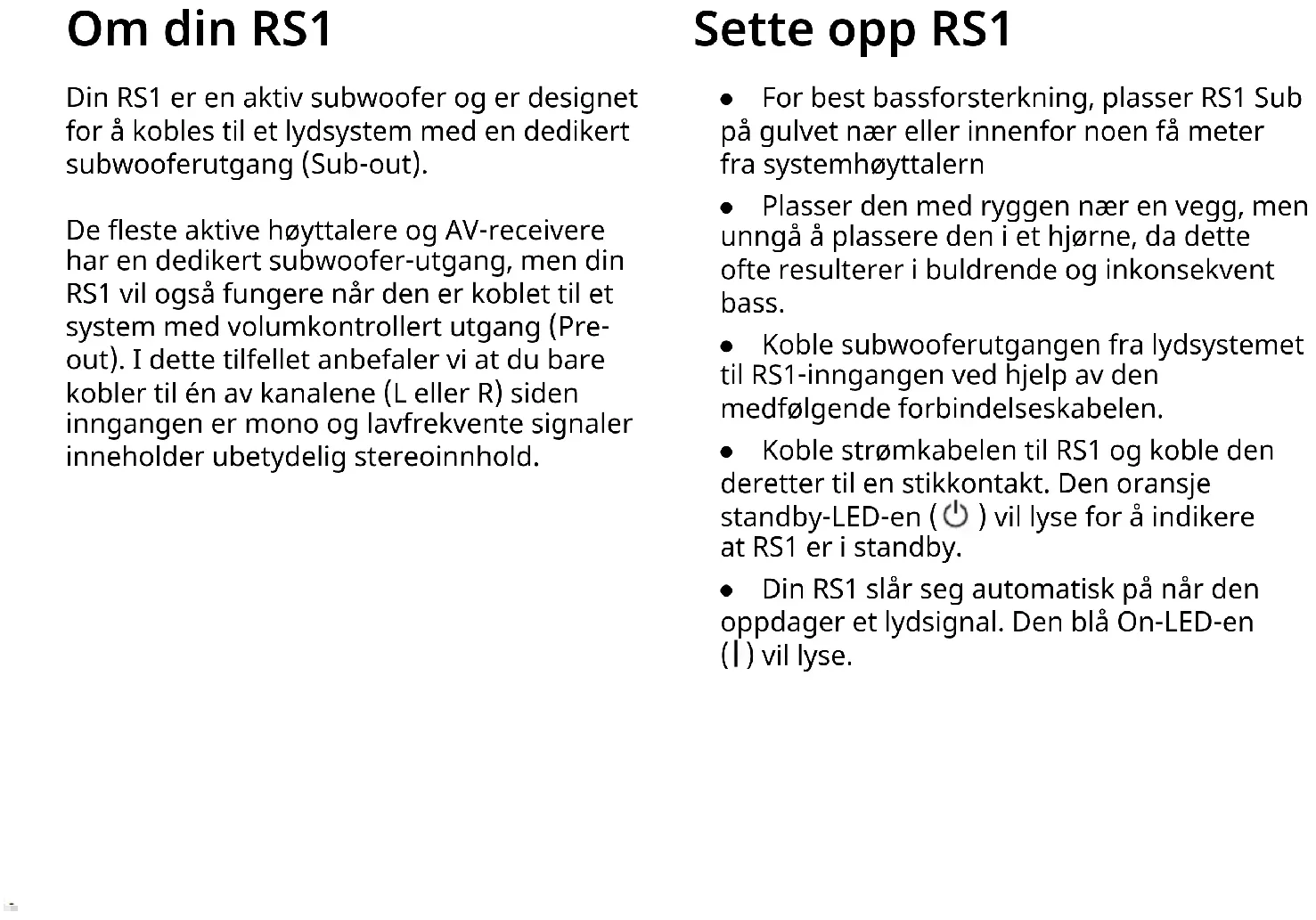 Finjustering av RS1 ● Akustikken i hvert rom er forskjellig, og det er viktig å bruke tid på å justere RS1-en slik at den smelter sømløst inn i systemet. ● Når den er riktig stilt inn, bør du ikke være klar over at bassen kommer fra RS1, og det skal høres ut som om all bassen produseres av systemets høyttalere. ● Start med å sette delelteret og volumnivåkontrollene til omtrent halvveis. ● Lytt til en rekke musikk som du kjenner godt, og juster RS1-volumnivået slik at det matcher systemet ditt. ● Eksperimenter med delefrekvensen, volumnivået og fasebryteren til du er fornøyd med bassen. ● Når du stiller inn RS1, er det viktig at du går tilbake til samme lytteposisjon for å bedømme effekten. ● Den endelige njusteringen vil være ned til din egen smak og preferanser, men hvis du er klar over at subwooferen er kilden til bassen, er det sannsynlig at delefrekvensen enten er satt for høyt eller subwoofervolumet er for høyt.Auto standby ● Din RS1 Sub har en automatisk standby- funksjon og er designet for alltid å være koblet til en stikkontakt. ● Når det ikke er noe lydsignal, vil RS1 Sub forbli i standby-tilstand for lavt strømforbruk og slå seg bare på når den oppdager en lydinngang. ● Etter omtrent 20 minutter uten lyd, vil RS1 Sub gå tilbake til standby for lavt strømforbruk. Overbelastningsbeskyttelse ● Din RS1 Sub har en sostikert myk klippefunksjon for å forhindre forvrengning og termisk overbelastning ved høye lyttenivåer. ● I det usannsynlige tilfellet at den blir overopphetet, vil begge statuslampene blinke, og den vil kutte lydutgangen til den interne temperaturen har stabilisert seg. Dette tar vanligvis noen minutter.EN