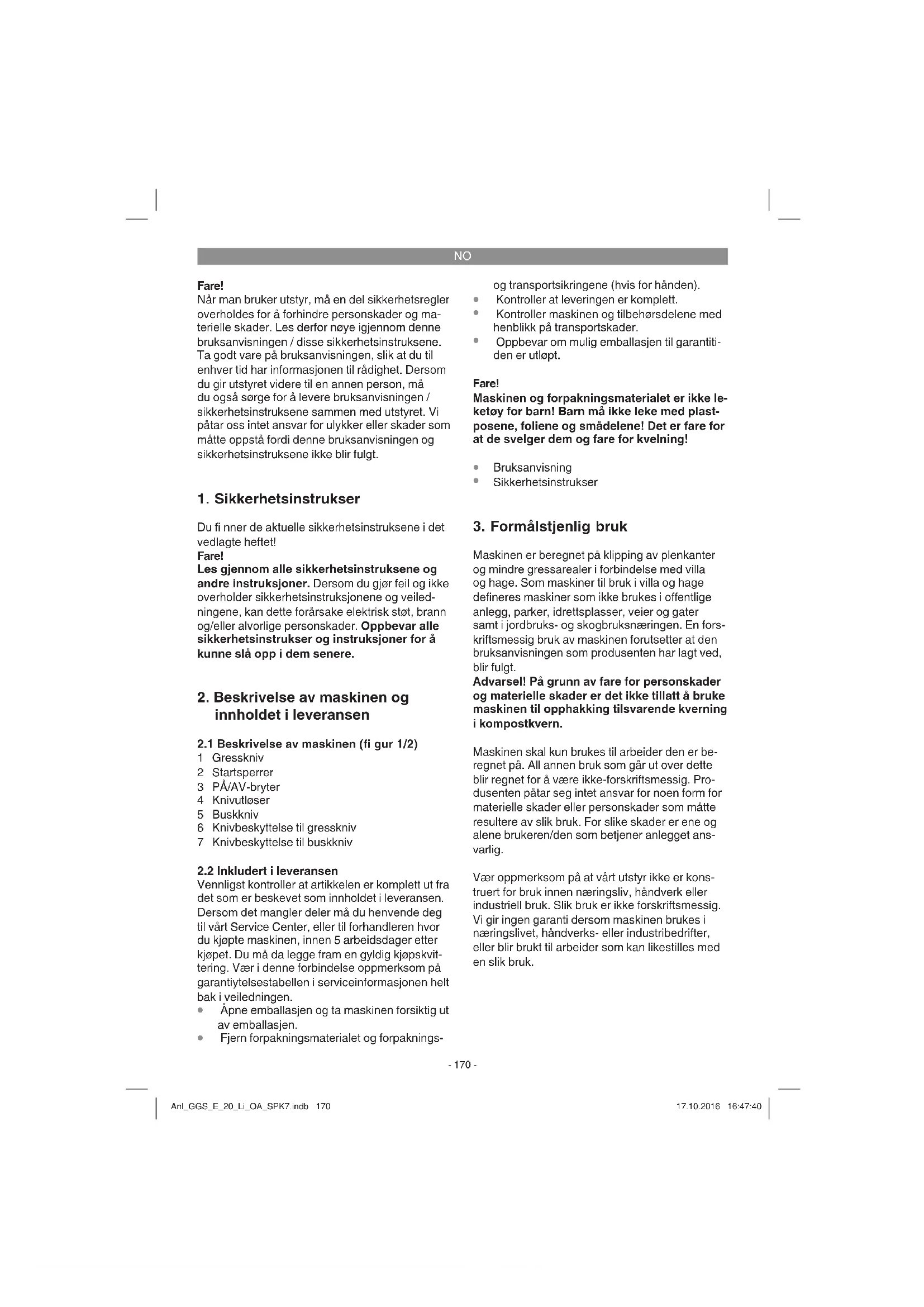 Maskinen er beregnet på klipping av plenkanter og mindre gressarealer i forbindelse med villa og hage. Som maskiner til bruk i villa og hage defi neres maskiner som ikke brukes i off entlige anlegg, parker, idrettsplasser, veier og gater samt i jordbruks- og skogbruksnæringen. En fors- kriftsmessig bruk av maskinen forutsetter at den bruksanvisningen som produsenten har lagt ved, blir fulgt. Advarsel! På grunn av fare for personskader og materielle skader er det ikke tillatt å bruke maskinen til opphakking tilsvarende kverning i kompostkvern. Maskinen skal kun brukes til arbeider den er be- regnet på. All annen bruk som går ut over dette blir regnet for å være ikke-forskriftsmessig. Pro- dusenten påtar seg intet ansvar for noen form for materielle skader eller personskader som måtte resultere av slik bruk. For slike skader er ene og alene brukeren/den som betjener anlegget ans- varlig. Vær oppmerksom på at vårt utstyr ikke er kons- truert for bruk innen næringsliv, håndverk eller industriell bruk. Slik bruk er ikke forskriftsmessig. Vi gir ingen garanti dersom maskinen brukes i næringslivet, håndverks- eller industribedrifter, eller blir brukt til arbeider som kan likestilles med en slik bruk. Anl_GGS_E_20_Li_OA_SPK7.indb 170Anl_GGS_E_20_Li_OA_SPK7.indb 170 17.10.2016 16:47:4017.10.2016 16:47:40NO