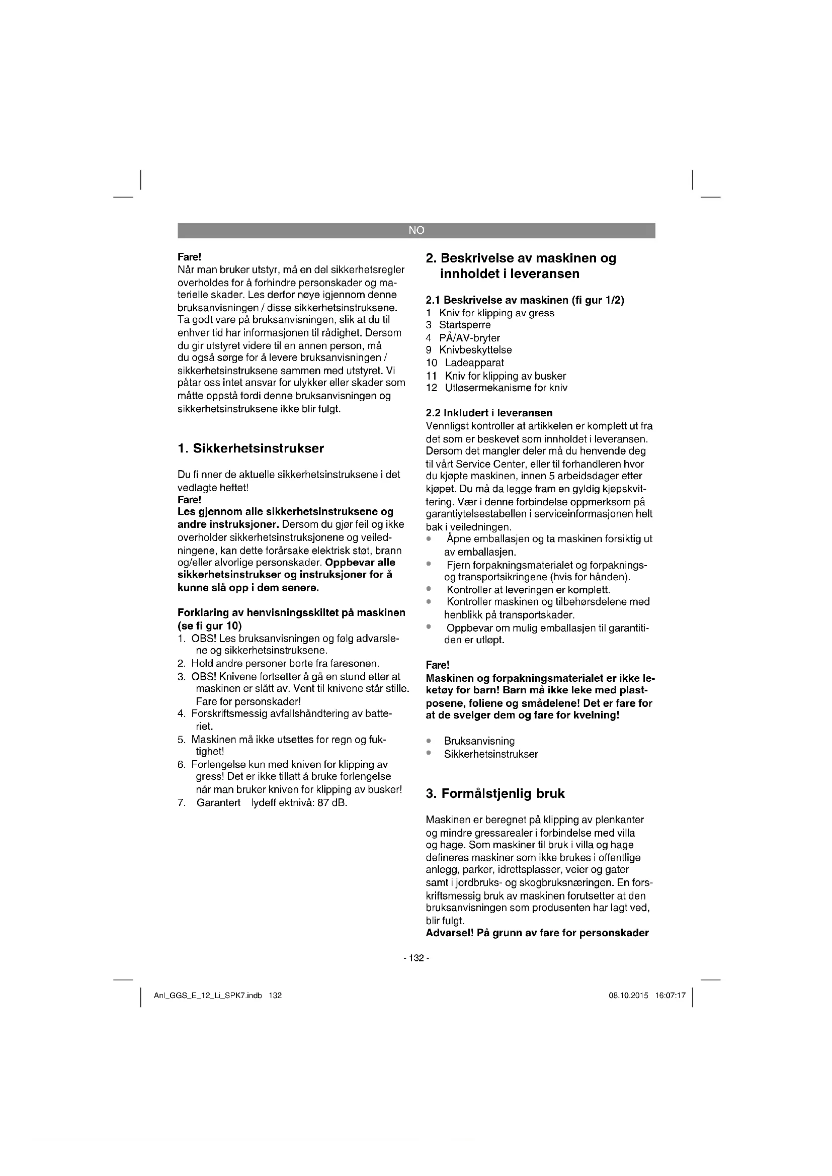 Maskinen er beregnet på klipping av plenkanter og mindre gressarealer i forbindelse med villa og hage. Som maskiner til bruk i villa og hage defi neres maskiner som ikke brukes i off entlige anlegg, parker, idrettsplasser, veier og gater samt i jordbruks- og skogbruksnæringen. En fors- kriftsmessig bruk av maskinen forutsetter at den bruksanvisningen som produsenten har lagt ved, blir fulgt. Advarsel! På grunn av fare for personskader Anl_GGS_E_12_Li_SPK7.indb 132Anl_GGS_E_12_Li_SPK7.indb 132 08.10.2015 16:07:1708.10.2015 16:07:17NO