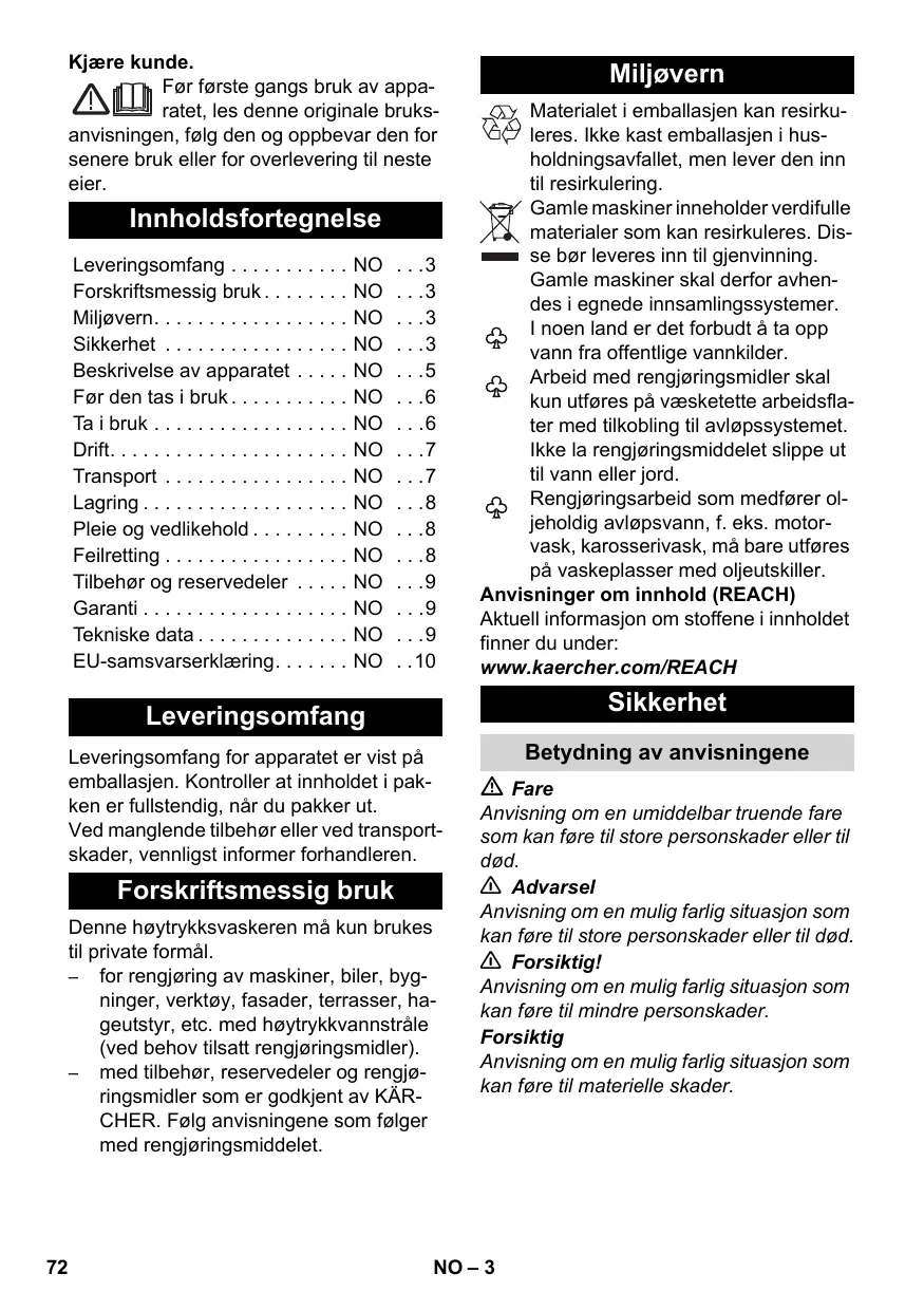 Miljøvern Materialet i emballasjen kan resirkuleres. Ikke kast emballasjen i husholdningsavfallet, men lever den inn til resirkulering. Gamle maskiner inneholder verdifulle materialer som kan resirkuleres. Disse bør leveres inn til gjenvinning. Gamle maskiner skal derfor avhendes i egnede innsamlingssystemer. I noen land er det forbudt å ta opp vann fra offentlige vannkilder. Arbeid med rengjøringsmidler skal kun utføres på væsketette arbeidsflater med tilkobling til avløpssystemet. Ikke la rengjøringsmiddelet slippe ut til vann eller jord. Rengjøringsarbeid som medfører oljeholdig avløpsvann, f. eks. motorvask, karosserivask, må bare utføres på vaskeplasser med oljeutskiller. Anvisninger om innhold (REACH) Aktuell informasjon om stoffene i innholdet finner du under: www.kaercher.com/REACH Sikkerhet Leveringsomfang Leveringsomfang for apparatet er vist på emballasjen. Kontroller at innholdet i pakken er fullstendig, når du pakker ut. Ved manglende tilbehør eller ved transportskader, vennligst informer forhandleren. Forskriftsmessig bruk Denne høytrykksvaskeren må kun brukes til private formål. – for rengjøring av maskiner, biler, bygninger, verktøy, fasader, terrasser, hageutstyr, etc. med høytrykkvannstråle (ved behov tilsatt rengjøringsmidler). – med tilbehør, reservedeler og rengjøringsmidler som er godkjent av KÄRCHER. Følg anvisningene som følger med rengjøringsmiddelet.