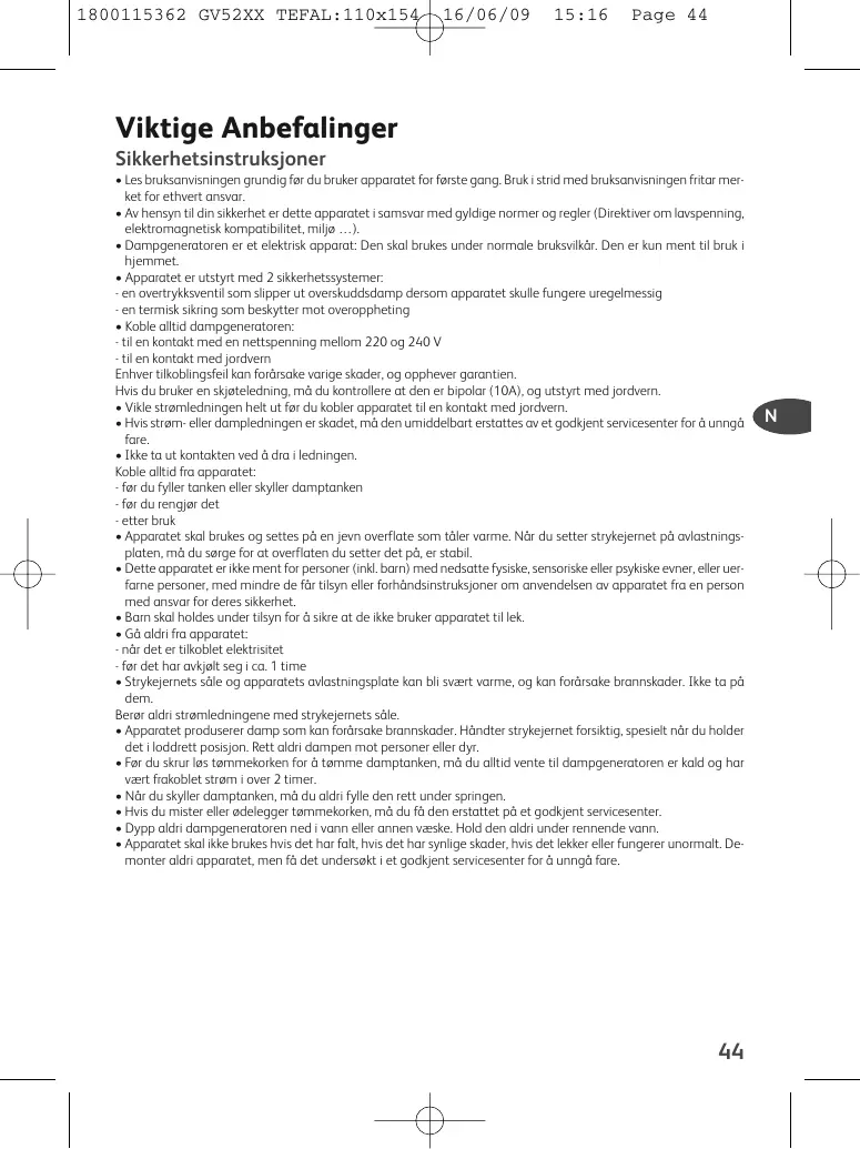D Sikkerhetsinstruksjoner • Les bruksanvisningen grundig før du bruker apparatet for første gang. Bruk i strid med bruksanvisningen fritar merket for ethvert ansvar. • Av hensyn til din sikkerhet er dette apparatet i samsvar med gyldige normer og regler (Direktiver om lavspenning, elektromagnetisk kompatibilitet, miljø …). • Dampgeneratoren er et elektrisk apparat: Den skal brukes under normale bruksvilkår. Den er kun ment til bruk i hjemmet. • Apparatet er utstyrt med 2 sikkerhetssystemer: - en overtrykksventil som slipper ut overskuddsdamp dersom apparatet skulle fungere uregelmessig - en termisk sikring som beskytter mot overoppheting • Koble alltid dampgeneratoren: - til en kontakt med en nettspenning mellom 220 og 240 V - til en kontakt med jordvern Enhver tilkoblingsfeil kan forårsake varige skader, og opphever garantien. Hvis du bruker en skjøteledning, må du kontrollere at den er bipolar (10A), og utstyrt med jordvern. • Vikle strømledningen helt ut før du kobler apparatet til en kontakt med jordvern. • Hvis strøm- eller dampledningen er skadet, må den umiddelbart erstattes av et godkjent servicesenter for å unngå fare. • Ikke ta ut kontakten ved å dra i ledningen. Koble alltid fra apparatet: - før du fyller tanken eller skyller damptanken - før du rengjør det - etter bruk • Apparatet skal brukes og settes på en jevn overflate som tåler varme. Når du setter strykejernet på avlastningsplaten, må du sørge for at overflaten du setter det på, er stabil. • Dette apparatet er ikke ment for personer (inkl. barn) med nedsatte fysiske, sensoriske eller psykiske evner, eller uerfarne personer, med mindre de får tilsyn eller forhåndsinstruksjoner om anvendelsen av apparatet fra en person med ansvar for deres sikkerhet. • Barn skal holdes under tilsyn for å sikre at de ikke bruker apparatet til lek. • Gå aldri fra apparatet: - når det er tilkoblet elektrisitet - før det har avkjølt seg i ca. 1 time • Strykejernets såle og apparatets avlastningsplate kan bli svært varme, og kan forårsake brannskader. Ikke ta på dem. Berør aldri strømledningene med strykejernets såle. • Apparatet produserer damp som kan forårsake brannskader. Håndter strykejernet forsiktig, spesielt når du holder det i loddrett posisjon. Rett aldri dampen mot personer eller dyr. • Før du skrur løs tømmekorken for å tømme damptanken, må du alltid vente til dampgeneratoren er kald og har vært frakoblet strøm i over 2 timer. • Når du skyller damptanken, må du aldri fylle den rett under springen. • Hvis du mister eller ødelegger tømmekorken, må du få den erstattet på et godkjent servicesenter. • Dypp aldri dampgeneratoren ned i vann eller annen væske. Hold den aldri under rennende vann. • Apparatet skal ikke brukes hvis det har falt, hvis det har synlige skader, hvis det lekker eller fungerer unormalt. Demonter aldri apparatet, men få det undersøkt i et godkjent servicesenter for å unngå fare.