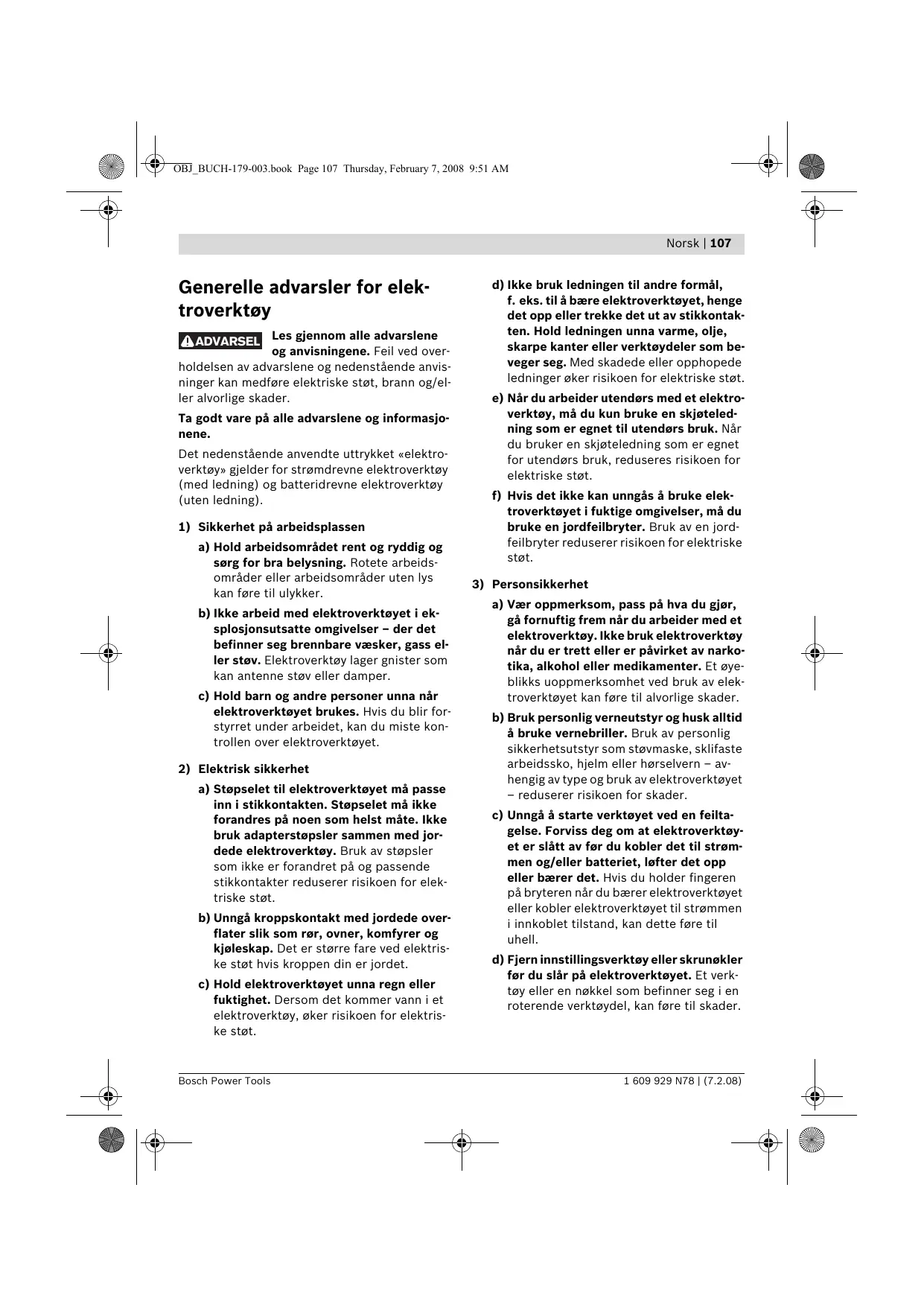 Lis Generelle advarsler for elek- troverktay PNG Les giennom alle advarsiene og anvisningene. Feil ved over- holdelsen av advarslene og nedenstäende anvis- ninger kan medfore elektriske stet, brann og/el- ler alvorlige skader. Ta godt vare pä alle advarslene og informasjo- nene. Det nedenstäende anvendte uttrykket «elektro- verktoy» gjelder for stramdrevne elektroverktoy {med ledning) og batteridrevne elektroverktay (uten ledning).