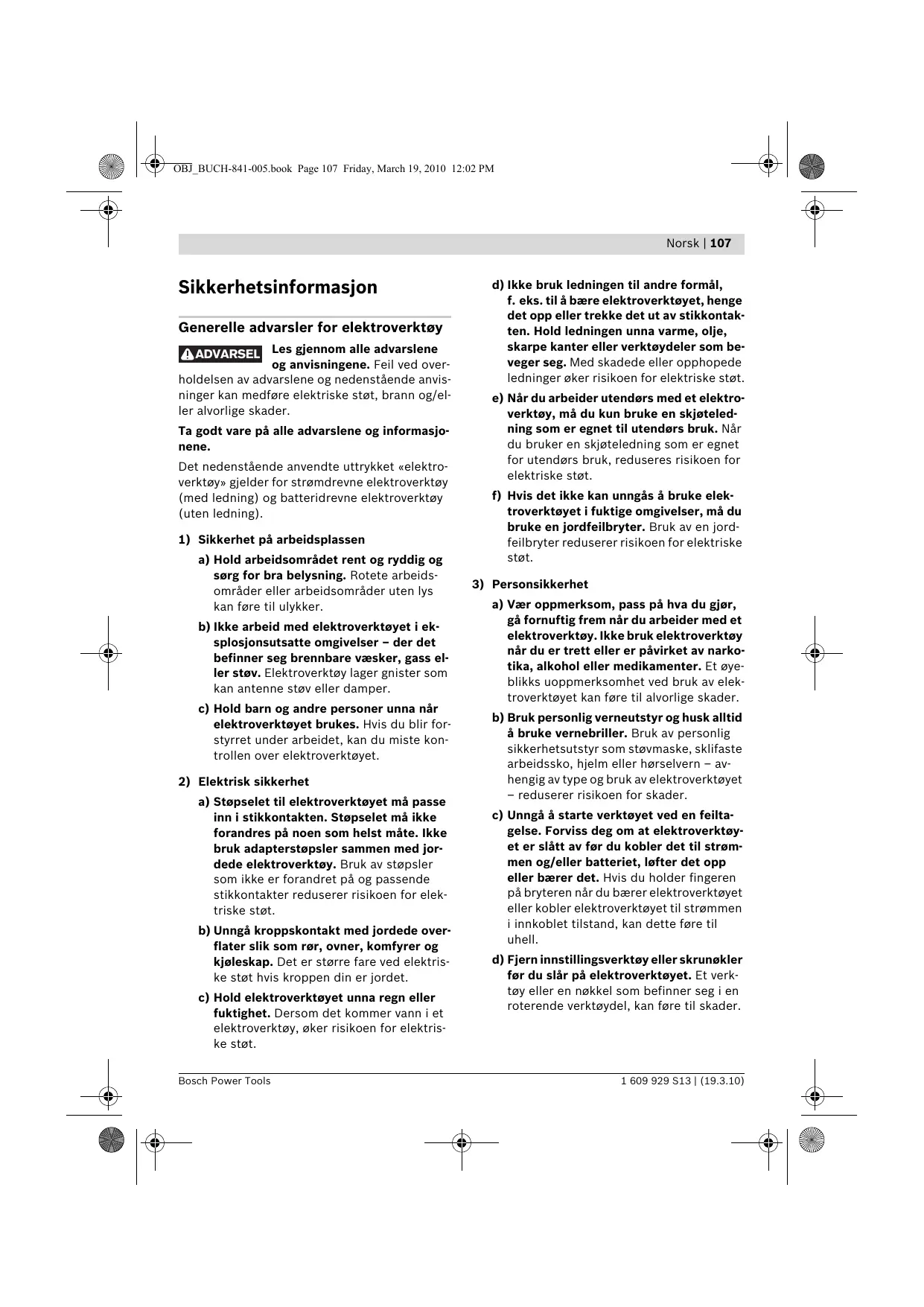 Lis Sikkerhetsinformasjon Generelle advarsler for elektroverktoy PYTEE Les gjennom alle advarslene 08 anvisningene. Feil ved over- holdelsen av advarslene og nedenstäende anvis- ninger kan medfore elektriske stet, brann og/el- ler alvorlige skader. Ta godt vare pä alle advarslene og informasjo- nene. Det nedenstäende anvendte uttrykket «elektro- verktoy» gjelder for stramdrevne elektroverktoy {med ledning) og batteridrevne elektroverktoy (uten ledning).