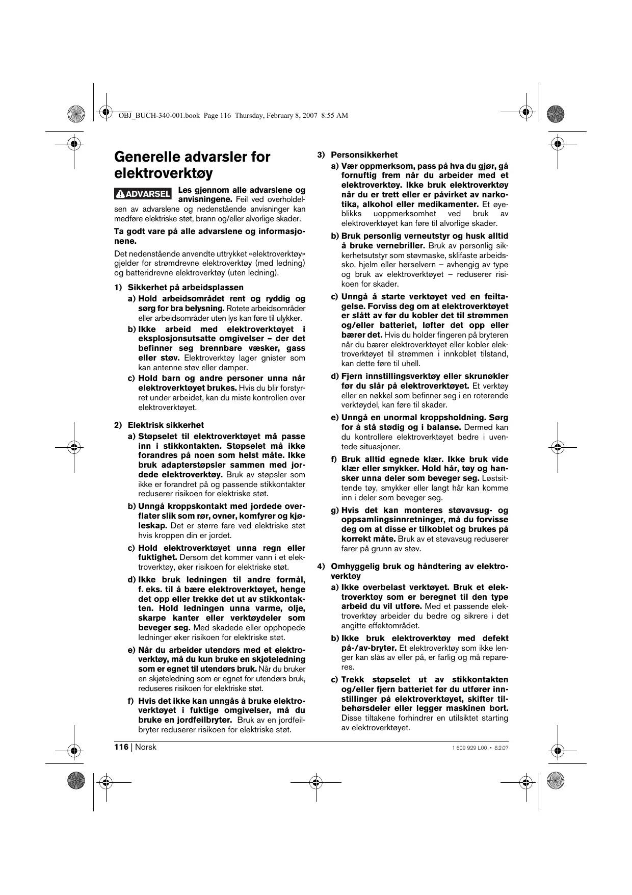 a) Ikke overbelast verktøyet. Bruk et elektroverktøy som er beregnet til den type arbeid du vil utføre. Med et passende elektroverktøy arbeider du bedre og sikrere i det angitte effektområdet. b) Ikke bruk elektroverktøy med defekt på-/av-bryter. Et elektroverktøy som ikke lenger kan slås av eller på, er farlig og må repareres. c) Trekk støpselet ut av stikkontakten og/eller fjern batteriet før du utfører innstillinger på elektroverktøyet, skifter tilbehørsdeler eller legger maskinen bort. Disse tiltakene forhindrer en utilsiktet starting av elektroverktøyet. 1 609 929 L00 • 8.2.07 OBJ_BUCH-340-001.book Page 117 Thursday, February 8, 2007 8:55 AM d) Elektroverktøy som ikke er i bruk må oppbevares utilgjengelig for barn. Ikke la maskinen brukes av personer som ikke er fortrolig med dette eller ikke har lest disse anvisningene. Elektroverktøy er farlige når de brukes av uerfarne personer. e) Vær nøye med vedlikeholdet av elektroverktøyet. Kontroller om bevegelige verktøydeler fungerer feilfritt og ikke klemmes fast, og om deler er brukket eller skadet, slik at dette innvirker på elektroverktøyets funksjon. La disse skadede delene repareres før elektroverktøyet brukes. Dårlig vedlikeholdte elektroverktøy er årsaken til mange uhell. f) Hold skjæreverktøyene skarpe og rene. Godt stelte skjæreverktøy med skarpe skjær setter seg ikke så ofte fast og er lettere å føre. g) Bruk elektroverktøy, tilbehør, verktøy osv. i henhold til disse anvisningene. Ta hensyn til arbeidsforholdene og arbeidet som skal utføres. Bruk av elektroverktøy til andre formål enn det som er angitt kan føre til farlige situasjoner.