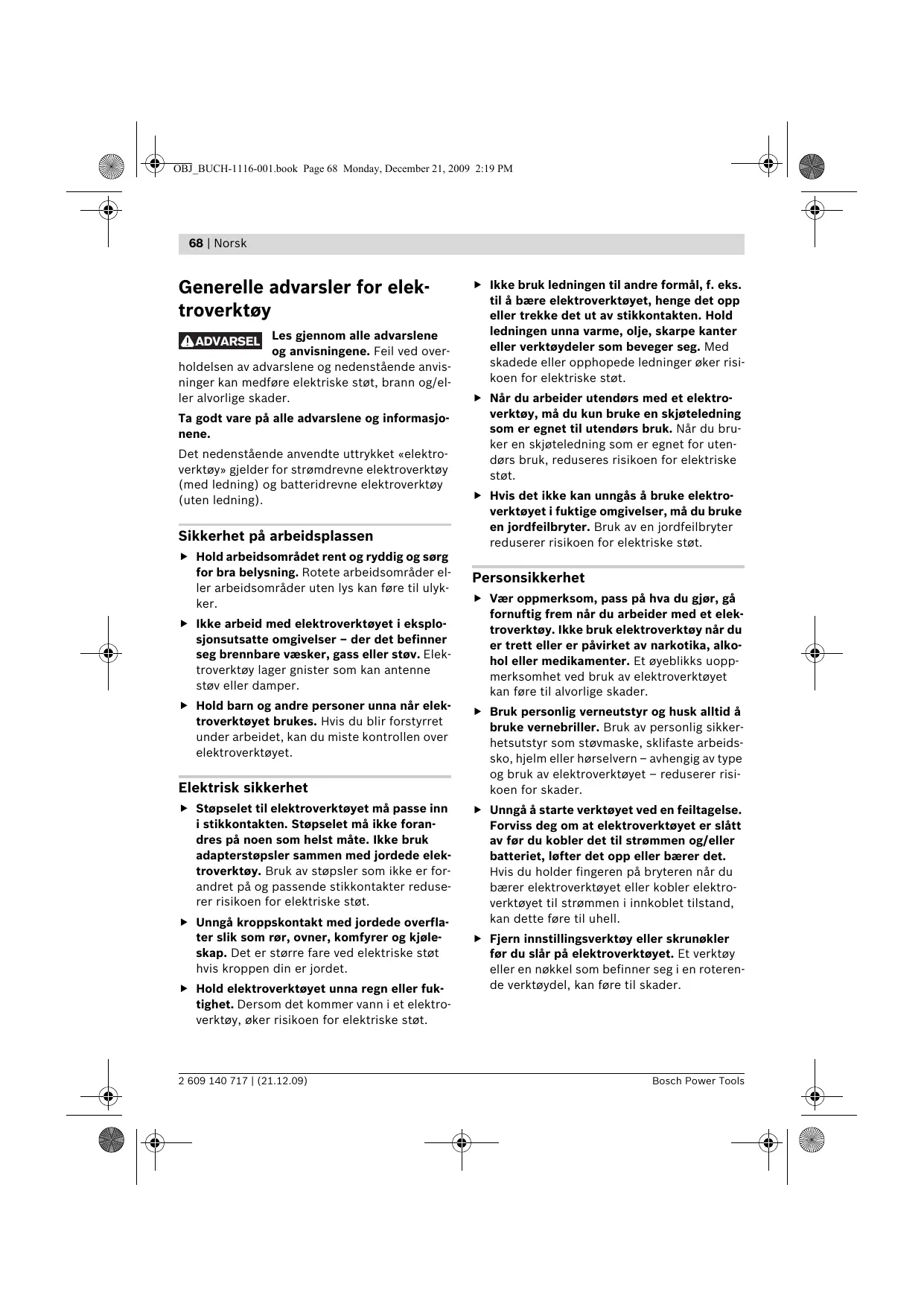 ADVARSEL Les gjennom alle advarslene og anvisningene. Feil ved overholdelsen av advarslene og nedenstående anvisninger kan medføre elektriske støt, brann og/eller alvorlige skader. Ta godt vare på alle advarslene og informasjonene. Det nedenstående anvendte uttrykket «elektroverktøy» gjelder for strømdrevne elektroverktøy (med ledning) og batteridrevne elektroverktøy (uten ledning). Sikkerhet på arbeidsplassen f Hold arbeidsområdet rent og ryddig og sørg for bra belysning. Rotete arbeidsområder eller arbeidsområder uten lys kan føre til ulykker. f Ikke arbeid med elektroverktøyet i eksplosjonsutsatte omgivelser – der det befinner seg brennbare væsker, gass eller støv. Elektroverktøy lager gnister som kan antenne støv eller damper. f Hold barn og andre personer unna når elektroverktøyet brukes. Hvis du blir forstyrret under arbeidet, kan du miste kontrollen over elektroverktøyet. Elektrisk sikkerhet f Støpselet til elektroverktøyet må passe inn i stikkontakten. Støpselet må ikke forandres på noen som helst måte. Ikke bruk adapterstøpsler sammen med jordede elektroverktøy. Bruk av støpsler som ikke er forandret på og passende stikkontakter reduserer risikoen for elektriske støt. f Unngå kroppskontakt med jordede overflater slik som rør, ovner, komfyrer og kjøleskap. Det er større fare ved elektriske støt hvis kroppen din er jordet. f Hold elektroverktøyet unna regn eller fuktighet. Dersom det kommer vann i et elektroverktøy, øker risikoen for elektriske støt. 2 609 140 717 | (21.12.09) f Ikke bruk ledningen til andre formål, f. eks. til å bære elektroverktøyet, henge det opp eller trekke det ut av stikkontakten. Hold ledningen unna varme, olje, skarpe kanter eller verktøydeler som beveger seg. Med skadede eller opphopede ledninger øker risikoen for elektriske støt. f Når du arbeider utendørs med et elektroverktøy, må du kun bruke en skjøteledning som er egnet til utendørs bruk. Når du bruker en skjøteledning som er egnet for utendørs bruk, reduseres risikoen for elektriske støt. f Hvis det ikke kan unngås å bruke elektroverktøyet i fuktige omgivelser, må du bruke en jordfeilbryter. Bruk av en jordfeilbryter reduserer risikoen for elektriske støt. Personsikkerhet f Vær oppmerksom, pass på hva du gjør, gå fornuftig frem når du arbeider med et elektroverktøy. Ikke bruk elektroverktøy når du er trett eller er påvirket av narkotika, alkohol eller medikamenter. Et øyeblikks uoppmerksomhet ved bruk av elektroverktøyet kan føre til alvorlige skader. f Bruk personlig verneutstyr og husk alltid å bruke vernebriller. Bruk av personlig sikkerhetsutstyr som støvmaske, sklifaste arbeidssko, hjelm eller hørselvern – avhengig av type og bruk av elektroverktøyet – reduserer risikoen for skader. f Unngå å starte verktøyet ved en feiltagelse. Forviss deg om at elektroverktøyet er slått av før du kobler det til strømmen og/eller batteriet, løfter det opp eller bærer det. Hvis du holder fingeren på bryteren når du bærer elektroverktøyet eller kobler elektroverktøyet til strømmen i innkoblet tilstand, kan dette føre til uhell. f Fjern innstillingsverktøy eller skrunøkler før du slår på elektroverktøyet. Et verktøy eller en nøkkel som befinner seg i en roterende verktøydel, kan føre til skader. Bosch Power Tools OBJ_BUCH-1116-001.book Page 69 Monday, December 21, 2009 2:19 PM Norsk | 69 f Unngå en unormal kroppsholdning. Sørg for å stå stødig og i balanse. Dermed kan du kontrollere elektroverktøyet bedre i uventede situasjoner. f Hold skjæreverktøyene skarpe og rene. Godt stelte skjæreverktøy med skarpe skjær setter seg ikke så ofte fast og er lettere å føre. f Bruk alltid egnede klær. Ikke bruk vide klær eller smykker. Hold hår, tøy og hansker unna deler som beveger seg. Løstsittende tøy, smykker eller langt hår kan komme inn i deler som beveger seg. f Bruk elektroverktøy, tilbehør, verktøy osv. i henhold til disse anvisningene. Ta hensyn til arbeidsforholdene og arbeidet som skal utføres. Bruk av elektroverktøy til andre formål enn det som er angitt kan føre til farlige situasjoner. f Hvis det kan monteres støvavsug- og oppsamlingsinnretninger, må du forvisse deg om at disse er tilkoblet og brukes på korrekt måte. Bruk av et støvavsug reduserer farer på grunn av støv. Omhyggelig bruk og håndtering av elektroverktøy f Ikke overbelast verktøyet. Bruk et elektroverktøy som er beregnet til den type arbeid du vil utføre. Med et passende elektroverktøy arbeider du bedre og sikrere i det angitte effektområdet. f Ikke bruk elektroverktøy med defekt på-/av-bryter. Et elektroverktøy som ikke lenger kan slås av eller på, er farlig og må repareres. f Trekk støpselet ut av stikkontakten og/eller fjern batteriet før du utfører innstillinger på elektroverktøyet, skifter tilbehørsdeler eller legger maskinen bort. Disse tiltakene forhindrer en utilsiktet starting av elektroverktøyet. f Elektroverktøy som ikke er i bruk må oppbevares utilgjengelig for barn. Ikke la maskinen brukes av personer som ikke er fortrolig med dette eller ikke har lest disse anvisningene. Elektroverktøy er farlige når de brukes av uerfarne personer. f Vær nøye med vedlikeholdet av elektroverktøyet. Kontroller om bevegelige verktøydeler fungerer feilfritt og ikke klemmes fast, og om deler er brukket eller skadet, slik at dette innvirker på elektroverktøyets funksjon. La disse skadede delene repareres før elektroverktøyet brukes. Dårlig vedlikeholdte elektroverktøy er årsaken til mange uhell. Bosch Power Tools Omhyggelig bruk og håndtering av batteridrevne verktøy f Lad batteriet kun opp i ladeapparater som er anbefalt av produsenten. Det oppstår brannfare hvis et ladeapparat som er egnet til en bestemt type batterier, brukes med andre batterier. f Bruk derfor kun riktig type batterier for elektroverktøyene. Bruk av andre batterier kan medføre skader og brannfare. f H