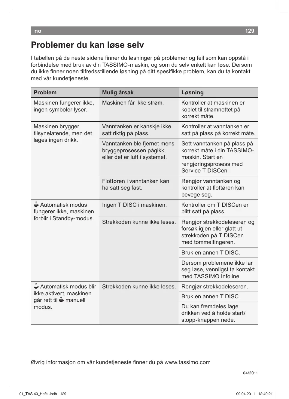 Problemer du kan løse selv I tabellen på de neste sidene finner du løsninger på problemer og feil som kan oppstå i forbindelse med bruk av din TASSIMO-maskin, og som du selv enkelt kan løse. Dersom du ikke finner noen tilfredsstillende løsning på ditt spesifikke problem, kan du ta kontakt med vår kundetjeneste. Problem Mulig årsak Løsning Maskinen fungerer ikke, ingen symboler lyser. Maskinen får ikke strøm. Kontroller at maskinen er koblet til strømnettet på korrekt måte. Maskinen brygger tilsynelatende, men det lages ingen drikk. Vanntanken er kanskje ikke satt riktig på plass. Kontroller at vanntanken er satt på plass på korrekt måte. Vanntanken ble fjernet mens bryggeprosessen pågikk, eller det er luft i systemet. Sett vanntanken på plass på korrekt måte i din TASSIMOmaskin. Start en rengjøringsprosess med Service T DISCen. Flottøren i vanntanken kan ha satt seg fast. Rengjør vanntanken og kontroller at flottøren kan bevege seg. Ingen T DISC i maskinen. Kontroller om T DISCen er blitt satt på plass. O Automatisk modus fungerer ikke, maskinen forblir i Standby-modus. Strekkoden kunne ikke leses. Rengjør strekkodeleseren og forsøk igjen eller glatt ut strekkoden på T DISCen med tommelfingeren. Bruk en annen T DISC. Dersom problemene ikke lar seg løse, vennligst ta kontakt med TASSIMO Infoline. O Automatisk modus blir ikke aktivert, maskinen går rett til N manuell modus. Strekkoden kunne ikke leses. Rengjør strekkodeleseren. Bruk en annen T DISC. Du kan fremdeles lage drikken ved å holde start/ stopp-knappen nede. Øvrig informasjon om vår kundetjeneste finner du på www.tassimo.com 04/2011 01_TAS 40_Heft1.indb 129