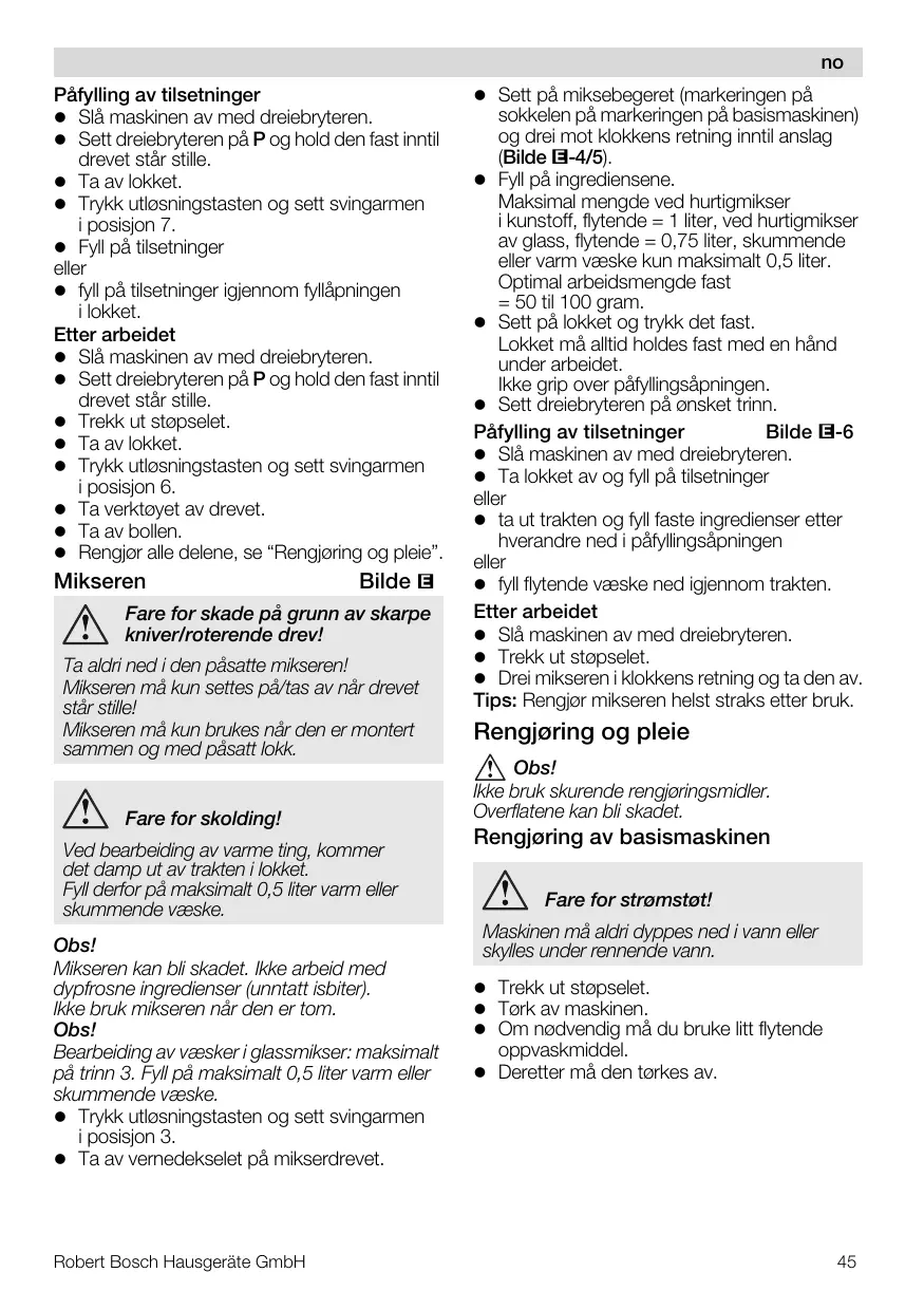 Påfylling av tilsetninger Slå maskinen av med dreiebryteren. Sett dreiebryteren på P og hold den fast inntil drevet står stille. Ta av lokket. Trykk utløsningstasten og sett svingarmen i posisjon 7. Fyll på tilsetninger eller fyll på tilsetninger igjennom fyllåpningen i lokket. Etter arbeidet Slå maskinen av med dreiebryteren. Sett dreiebryteren på P og hold den fast inntil drevet står stille. Trekk ut støpselet. Ta av lokket. Trykk utløsningstasten og sett svingarmen i posisjon 6. Ta verktøyet av drevet. Ta av bollen. Rengjør alle delene, se “Rengjøring og pleie”. Mikseren Bilde c~êÉ=Ñçê=ëâ~ÇÉ=é™=Öêìåå=~î=ëâ~êéÉ= âåáîÉêLêçíÉêÉåÇÉ=ÇêÉî> q~=~äÇêá=åÉÇ=á=ÇÉå=é™ë~ííÉ=ãáâëÉêÉå>= jáâëÉêÉå=ã™=âìå=ëÉííÉë=é™Lí~ë=~î=å™ê=ÇêÉîÉí= ëí™ê=ëíáääÉ>= jáâëÉêÉå=ã™=âìå=ÄêìâÉë=å™ê=ÇÉå=Éê=ãçåíÉêí= ë~ããÉå=çÖ=ãÉÇ=é™ë~íí=äçââK c~êÉ=Ñçê=ëâçäÇáåÖ> sÉÇ=ÄÉ~êÄÉáÇáåÖ=~î=î~êãÉ=íáåÖI=âçããÉê= ÇÉí Ç~ãé=ìí=~î=íê~âíÉå=á=äçââÉíK= cóää=ÇÉêÑçê=é™=ã~âëáã~äí=MIR=äáíÉê=î~êã=ÉääÉê= ëâìããÉåÇÉ=î‹ëâÉK lÄë> jáâëÉêÉå=â~å=Ääá=ëâ~ÇÉíK=fââÉ=~êÄÉáÇ=ãÉÇ= ÇóéÑêçëåÉ=áåÖêÉÇáÉåëÉê=Eìååí~íí=áëÄáíÉêFK= fââÉ Äêìâ=ãáâëÉêÉå=å™ê=ÇÉå=Éê=íçãK lÄë> _É~êÄÉáÇáåÖ=~î=î‹ëâÉê=á=Öä~ëëãáâëÉêW=ã~âëáã~äí= é™=íêáåå=PK=cóää=é™=ã~âëáã~äí=MIR=äáíÉê=î~êã=ÉääÉê= ëâìããÉåÇÉ=î‹ëâÉK Trykk utløsningstasten og sett svingarmen i posisjon 3. Ta av vernedekselet på mikserdrevet. Robert Bosch Hausgeräte GmbH Sett på miksebegeret (markeringen på sokkelen på markeringen på basismaskinen) og drei mot klokkens retning inntil anslag (Bilde -4/5). Fyll på ingrediensene. Maksimal mengde ved hurtigmikser i kunstoff, flytende = 1 liter, ved hurtigmikser av glass, flytende = 0,75 liter, skummende eller varm væske kun maksimalt 0,5 liter. Optimal arbeidsmengde fast = 50 til 100 gram. Sett på lokket og trykk det fast. Lokket må alltid holdes fast med en hånd under arbeidet. Ikke grip over påfyllingsåpningen. Sett dreiebryteren på ønsket trinn. Påfylling av tilsetninger Bilde -6 Slå maskinen av med dreiebryteren. Ta lokket av og fyll på tilsetninger eller ta ut trakten og fyll faste ingredienser etter hverandre ned i påfyllingsåpningen eller fyll flytende væske ned igjennom trakten. Etter arbeidet Slå maskinen av med dreiebryteren. Trekk ut støpselet. Drei mikseren i klokkens retning og ta den av. Tips: Rengjør mikseren helst straks etter bruk. Rengjøring og pleie lÄë> fââÉ=Äêìâ=ëâìêÉåÇÉ=êÉåÖà›êáåÖëãáÇäÉêK= lîÉêÑä~íÉåÉ â~å=Ääá=ëâ~ÇÉíK= Rengjøring av basismaskinen c~êÉ=Ñçê=ëíê›ãëí›í> j~ëâáåÉå=ã™=~äÇêá=ÇóééÉë=åÉÇ=á=î~åå=ÉääÉê= ëâóääÉë=ìåÇÉê=êÉååÉåÇÉ=î~ååK Trekk ut støpselet. Tørk av maskinen. Om nødvendig må du bruke litt flytende oppvaskmiddel. Deretter må den tørkes av.
