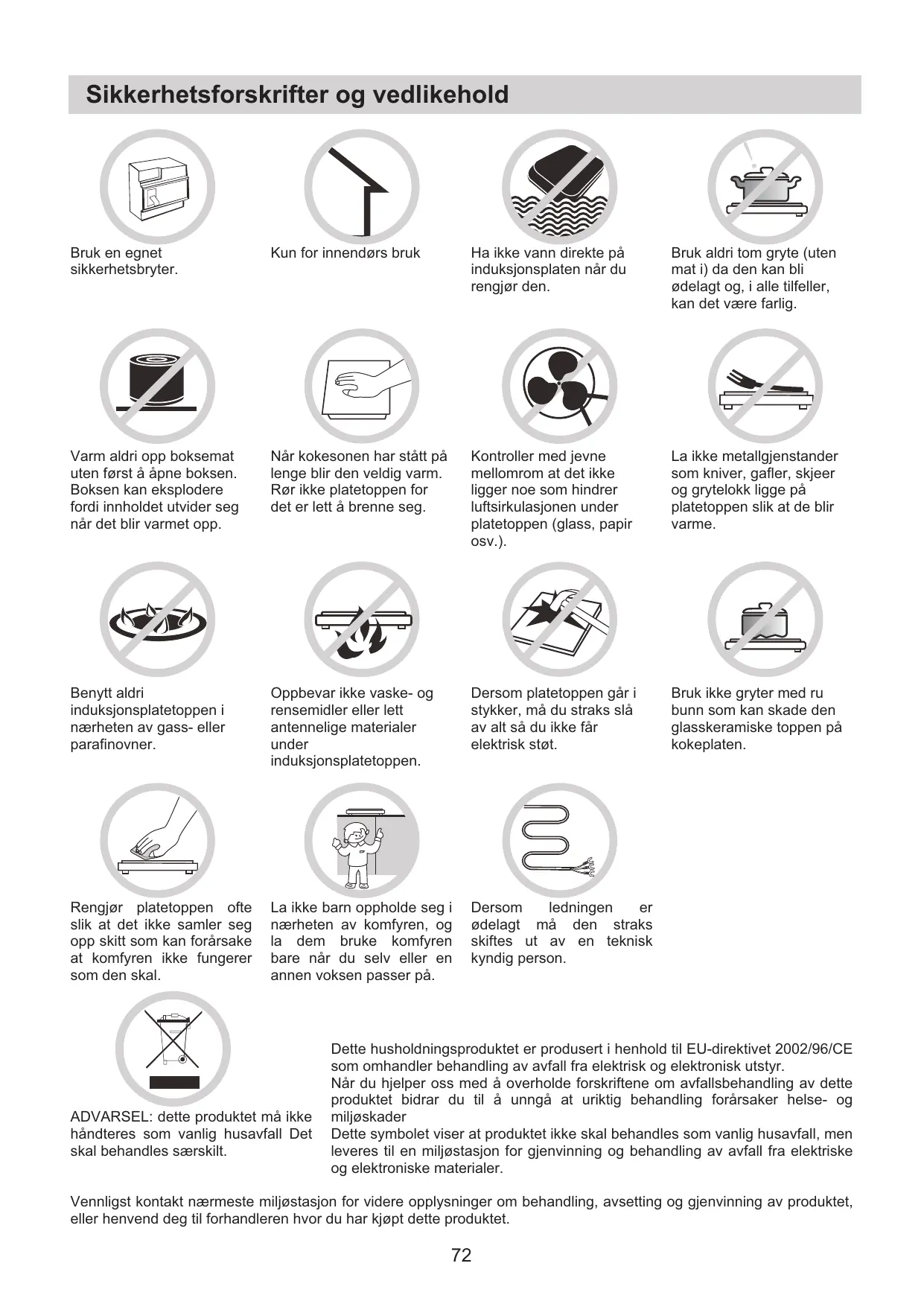 NORWEGLIAN Sikkerhetsfunksjon Platetoppen er utstyrt med barnesikring som sperrer bruken av induksjonsplaten. Trykk inn tasten for sperreanordningen (Interlock) for å sperre: kokeplaten sperres, timerdisplayet viser symbolet ”Lo” og alle de andre funksjonene er utkoplet. Oppheve sperren Hold tasten for sperreanordningen (Interlock) inne i 3 sekunder: Sikkerhetsforskrifter og vedlikehold Bruk en egnet sikkerhetsbryter. Kun for innendørs bruk Ha ikke vann direkte på induksjonsplaten når du rengjør den. Bruk aldri tom gryte (uten mat i) da den kan bli ødelagt og, i alle tilfeller, kan det være farlig. Varm aldri opp boksemat uten først å åpne boksen. Boksen kan eksplodere fordi innholdet utvider seg når det blir varmet opp. Når kokesonen har stått på lenge blir den veldig varm. Rør ikke platetoppen for det er lett å brenne seg. Kontroller med jevne mellomrom at det ikke ligger noe som hindrer luftsirkulasjonen under platetoppen (glass, papir osv.). La ikke metallgjenstander som kniver, gafler, skjeer og grytelokk ligge på platetoppen slik at de blir varme. Benytt aldri induksjonsplatetoppen i nærheten av gass- eller parafinovner. Oppbevar ikke vaske- og rensemidler eller lett antennelige materialer under induksjonsplatetoppen. Dersom platetoppen går i stykker, må du straks slå av alt så du ikke får elektrisk støt. Bruk ikke gryter med ru bunn som kan skade den glasskeramiske toppen på kokeplaten. Rengjør platetoppen ofte slik at det ikke samler seg opp skitt som kan forårsake at komfyren ikke fungerer som den skal. La ikke barn oppholde seg i nærheten av komfyren, og la dem bruke komfyren bare når du selv eller en annen voksen passer på. Dersom ledningen ødelagt må den straks skiftes ut av en teknisk kyndig person. ADVARSEL: dette produktet må ikke håndteres som vanlig husavfall Det skal behandles særskilt. Dette husholdningsproduktet er produsert i henhold til EU-direktivet 2002/96/CE som omhandler behandling av avfall fra elektrisk og elektronisk utstyr. Når du hjelper oss med å overholde forskriftene om avfallsbehandling av dette produktet bidrar du til å unngå at uriktig behandling forårsaker helse- og miljøskader Dette symbolet viser at produktet ikke skal behandles som vanlig husavfall, men leveres til en miljøstasjon for gjenvinning og behandling av avfall fra elektriske og elektroniske materialer. Vennligst kontakt nærmeste miljøstasjon for videre opplysninger om behandling, avsetting og gjenvinning av produktet, eller henvend deg til forhandleren hvor du har kjøpt dette produktet.