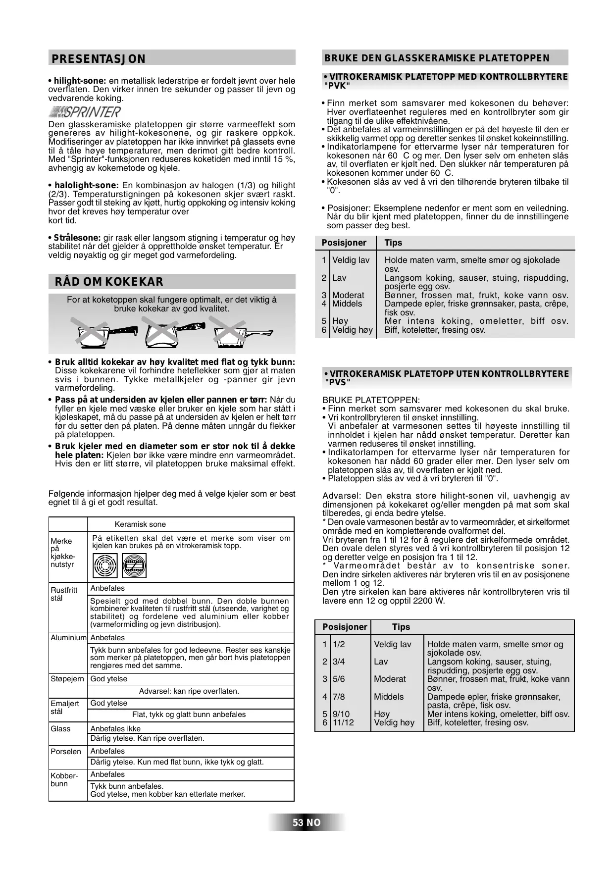 - VITROKERAMISK PLATETOPP UTEN KONTROLLBRYTERE "PVS" Flat, tykk og glatt bunn anbefales Tykk bunn anbefales. God ytelse, men kobber kan etterlate merker. 53 NO Tips 1 1/2 Veldig lav 2 3/4 Lav 3 5/6 Moderat 4 7/8 Middels 5 9/10 6 11/12 Høy Veldig høy Holde maten varm, smelte smør og sjokolade osv. Langsom koking, sauser, stuing, rispudding, posjerte egg osv. Bønner, frossen mat, frukt, koke vann osv. Dampede epler, friske grønnsaker, pasta, crêpe, fisk osv. Mer intens koking, omeletter, biff osv. Biff, koteletter, fresing osv.