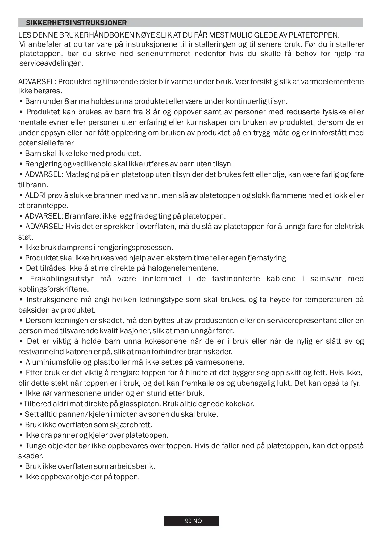 - ADVARSEL: Matlaging på en platetopp uten tilsyn der det brukes fett eller olje, kan være farlig og føre til brann.