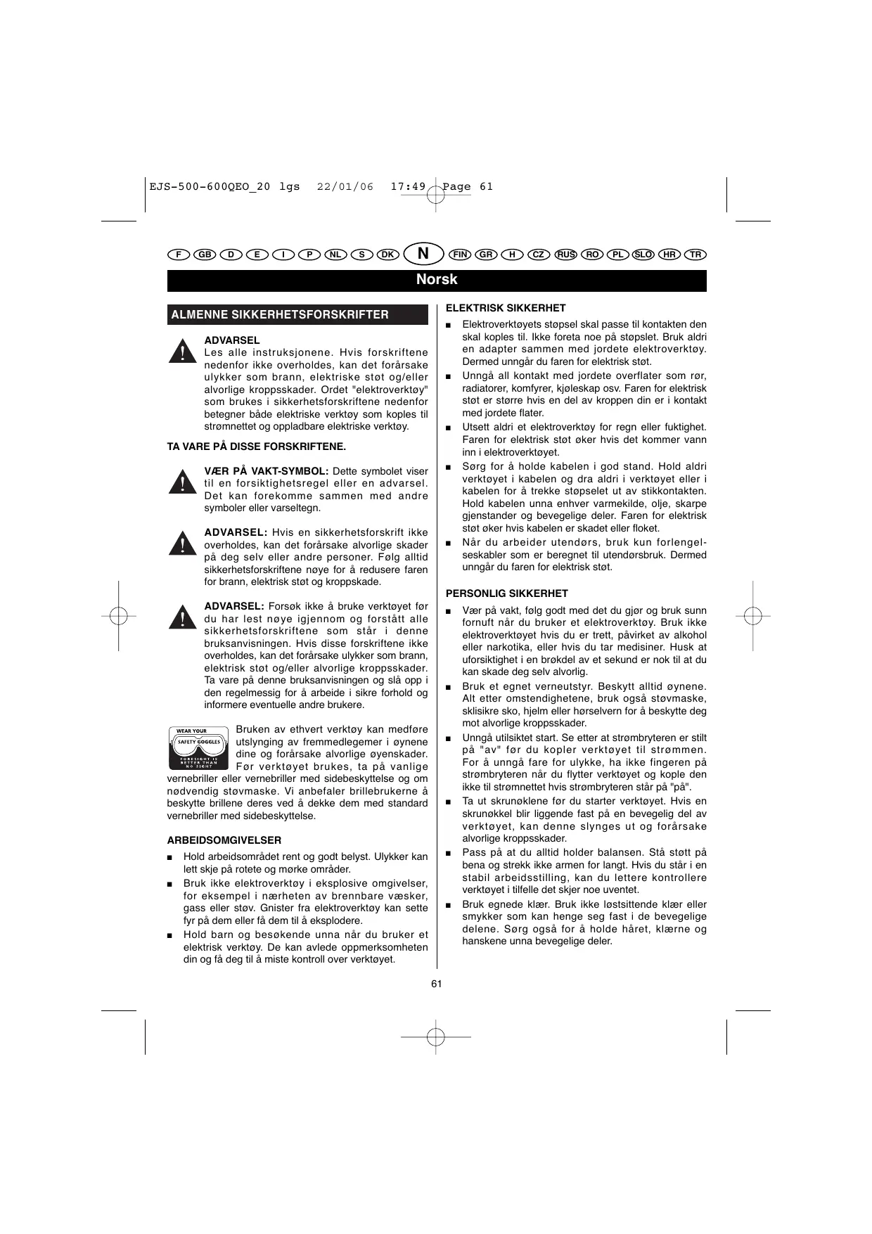 Vær på vakt, følg godt med det du gjør og bruk sunn fornuft når du bruker et elektroverktøy. Bruk ikke elektroverktøyet hvis du er trett, påvirket av alkohol eller narkotika, eller hvis du tar medisiner. Husk at uforsiktighet i en brøkdel av et sekund er nok til at du kan skade deg selv alvorlig. Bruk et egnet verneutstyr. Beskytt alltid øynene. Alt etter omstendighetene, bruk også støvmaske, sklisikre sko, hjelm eller hørselvern for å beskytte deg mot alvorlige kroppsskader. Unngå utilsiktet start. Se etter at strømbryteren er stilt på "av" før du kopler verktøyet til strømmen. For å unngå fare for ulykke, ha ikke fingeren på strømbryteren når du flytter verktøyet og kople den ikke til strømnettet hvis strømbryteren står på "på". Ta ut skrunøklene før du starter verktøyet. Hvis en skrunøkkel blir liggende fast på en bevegelig del av verktøyet, kan denne slynges ut og forårsake alvorlige kroppsskader. Pass på at du alltid holder balansen. Stå støtt på bena og strekk ikke armen for langt. Hvis du står i en stabil arbeidsstilling, kan du lettere kontrollere verktøyet i tilfelle det skjer noe uventet. Bruk egnede klær. Bruk ikke løstsittende klær eller smykker som kan henge seg fast i de bevegelige delene. Sørg også for å holde håret, klærne og hanskene unna bevegelige deler. 22/01/06 EJS-500-600QEO_20 lgs