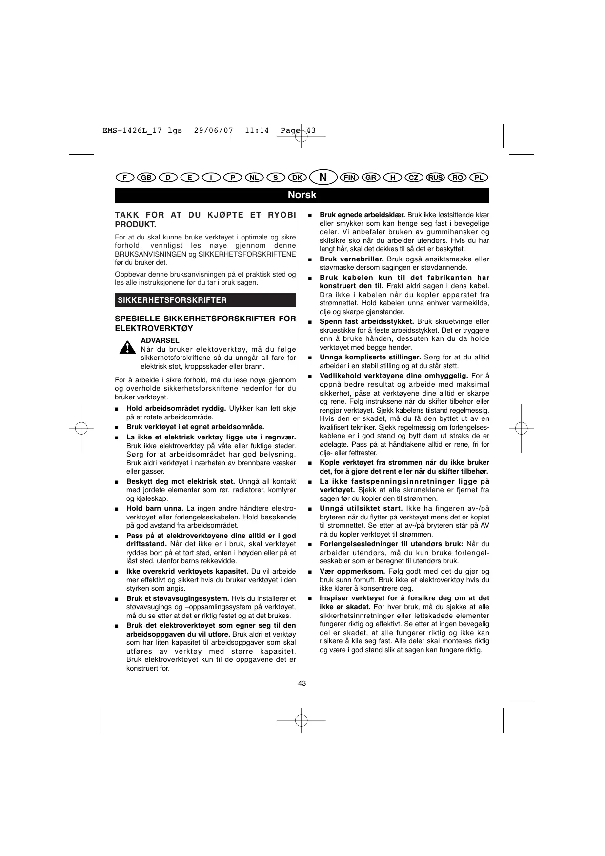 Bruk egnede arbeidsklær. Bruk ikke løstsittende klær eller smykker som kan henge seg fast i bevegelige deler. Vi anbefaler bruken av gummihansker og sklisikre sko når du arbeider utendørs. Hvis du har langt hår, skal det dekkes til så det er beskyttet. Bruk vernebriller. Bruk også ansiktsmaske eller støvmaske dersom sagingen er støvdannende. Bruk kabelen kun til det fabrikanten har konstruert den til. Frakt aldri sagen i dens kabel. Dra ikke i kabelen når du kopler apparatet fra strømnettet. Hold kabelen unna enhver varmekilde, olje og skarpe gjenstander. Spenn fast arbeidsstykket. Bruk skruetvinge eller skruestikke for å feste arbeidsstykket. Det er tryggere enn å bruke hånden, dessuten kan du da holde verktøyet med begge hender. Unngå kompliserte stillinger. Sørg for at du alltid arbeider i en stabil stilling og at du står støtt. Vedlikehold verktøyene dine omhyggelig. For å oppnå bedre resultat og arbeide med maksimal sikkerhet, påse at verktøyene dine alltid er skarpe og rene. Følg instruksene når du skifter tilbehør eller rengjør verktøyet. Sjekk kabelens tilstand regelmessig. Hvis den er skadet, må du få den byttet ut av en kvalifisert tekniker. Sjekk regelmessig om forlengelseskablene er i god stand og bytt dem ut straks de er ødelagte. Pass på at håndtakene alltid er rene, fri for olje- eller fettrester. Kople verktøyet fra strømmen når du ikke bruker det, for å gjøre det rent eller når du skifter tilbehør. La ikke fastspenningsinnretninger ligge på verktøyet. Sjekk at alle skrunøklene er fjernet fra sagen før du kopler den til strømmen. Unngå utilsiktet start. Ikke ha fingeren av-/på bryteren når du flytter på verktøyet mens det er koplet til strømnettet. Se etter at av-/på bryteren står på AV nå du kopler verktøyet til strømmen. Forlengelsesledninger til utendørs bruk: Når du arbeider utendørs, må du kun bruke forlengelseskabler som er beregnet til utendørs bruk. Vær oppmerksom. Følg godt med det du gjør og bruk sunn fornuft. Bruk ikke et elektroverktøy hvis du ikke klarer å konsentrere deg. Inspiser verktøyet for å forsikre deg om at det ikke er skadet. Før hver bruk, må du sjekke at alle sikkerhetsinnretninger eller lettskadede elementer fungerer riktig og effektivt. Se etter at ingen bevegelig del er skadet, at alle fungerer riktig og ikke kan risikere å kile seg fast. Alle deler skal monteres riktig og være i god stand slik at sagen kan fungere riktig. EMS-1426L_17 lgs