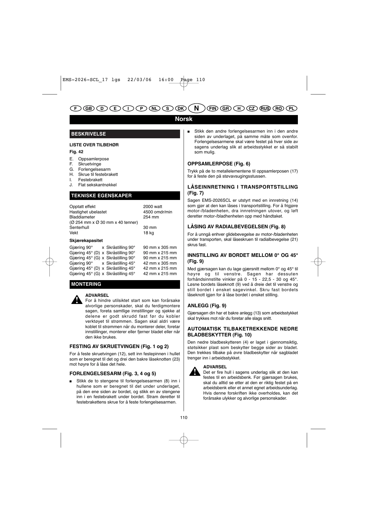 (Fig. 7) TEKNISKE EGENSKAPER Opptatt effekt Hastighet ubelastet Bladdiameter (Ø 254 mm x Ø 30 mm x 40 tenner) Senterhull Vekt Sagen EMS-2026SCL er utstyrt med en innretning (14) som gjør at den kan låses i transportstilling. For å frigjøre motor-/bladenheten, dra innretningen utover, og løft deretter motor-/bladhenheten opp med håndtaket. 2000 watt 4500 omdr/min 254 mm LÅSING AV RADIALBEVEGELSEN (Fig. 8) 30 mm 18 kg For å unngå enhver glidebevegelse av motor-/bladenheten under transporten, skal låseskruen til radialbevegelse (21) skrus fast. Skjærekapasitet Gjæring 90° Gjæring 45° (D) Gjæring 45° (G) Gjæring 90° Gjæring 45° (D) Gjæring 45° (G)