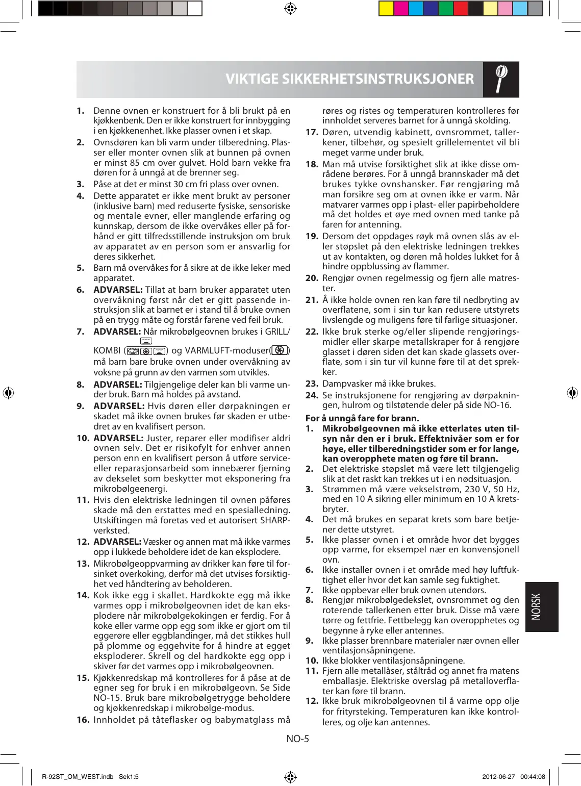 for frityrsteking. Temperaturen kan ikke kontrolleres, og olje kan antennes. NORSK VIKTIGE SIKKERHETSINSTRUKSJONER NO-5 R-92ST_OM_WEST.indb Sek1:5 2012-06-27 00:44:08 VIKTIGE SIKKERHETSINSTRUKSJONER