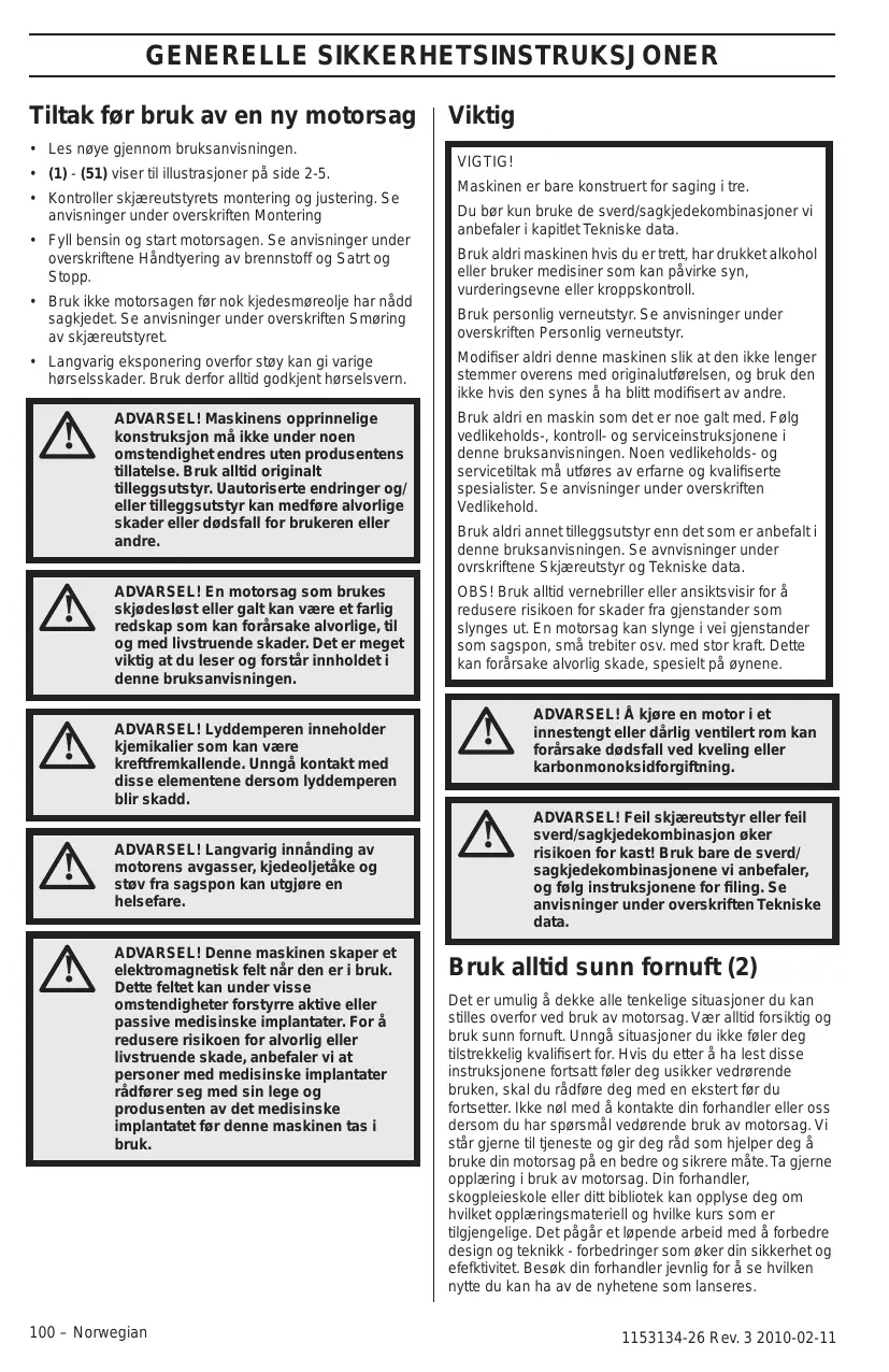 ADVARSEL! En motorsag som brukes skjødesløst eller galt kan være et farlig redskap som kan forårsake alvorlige, til og med livstruende skader. Det er meget viktig at du leser og forstår innholdet i denne bruksanvisningen.