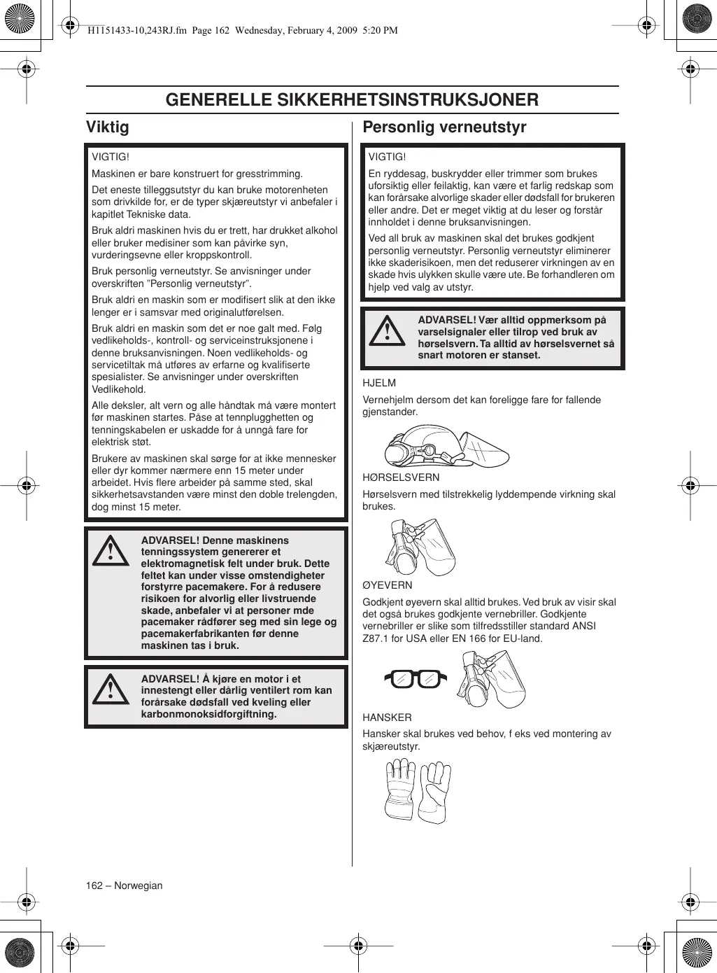 ADVARSEL! Denne maskinens tenningssystem genererer et elektromagnetisk felt under bruk. Dette feltet kan under visse omstendigheter forstyrre pacemakere. For å redusere risikoen for alvorlig eller livstruende skade, anbefaler vi at personer mde pacemaker rådfører seg med sin lege og pacemakerfabrikanten før denne maskinen tas i bruk. ADVARSEL! Å kjøre en motor i et innestengt eller dårlig ventilert rom kan forårsake dødsfall ved kveling eller karbonmonoksidforgiftning.