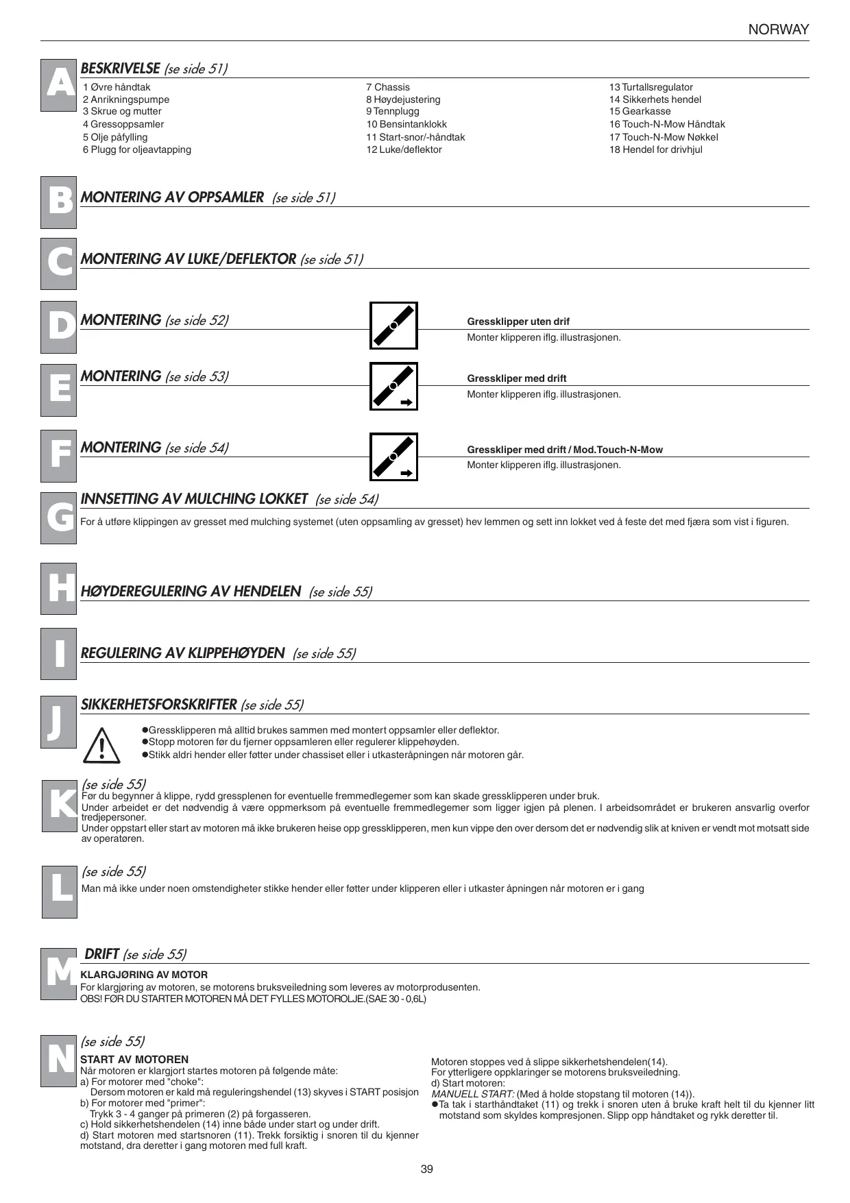 7 Chassis 8 Høydejustering 9 Tennplugg 10 Bensintanklokk 11 Start-snor/-håndtak 12 Luke/deflektor 13 Turtallsregulator 14 Sikkerhets hendel 15 Gearkasse 16 Touch-N-Mow Håndtak 17 Touch-N-Mow Nøkkel 18 Hendel for drivhjul Gressklipper uten drif Monter klipperen iflg. illustrasjonen. Gresskliper med drift Monter klipperen iflg. illustrasjonen. Gresskliper med drift / Mod.Touch-N-Mow Monter klipperen iflg. illustrasjonen. INNSETTING AV MULCHING LOKKET (se side 54) For å utføre klippingen av gresset med mulching systemet (uten oppsamling av gresset) hev lemmen og sett inn lokket ved å feste det med fjæra som vist i figuren. HØYDEREGULERING AV HENDELEN (se side 55) REGULERING AV KLIPPEHØYDEN (se side 55) SIKKERHETSFORSKRIFTER (se side 55) lGressklipperen må alltid brukes sammen med montert oppsamler eller deflektor. lStopp motoren før du fjerner oppsamleren eller regulerer klippehøyden. lStikk aldri hender eller føtter under chassiset eller i utkasteråpningen når motoren går. (se side 55) Før du begynner å klippe, rydd gressplenen for eventuelle fremmedlegemer som kan skade gressklipperen under bruk. Under arbeidet er det nødvendig å være oppmerksom på eventuelle fremmedlegemer som ligger igjen på plenen. I arbeidsområdet er brukeren ansvarlig overfor tredjepersoner. Under oppstart eller start av motoren må ikke brukeren heise opp gressklipperen, men kun vippe den over dersom det er nødvendig slik at kniven er vendt mot motsatt side av operatøren. (se side 55) Man må ikke under noen omstendigheter stikke hender eller føtter under klipperen eller i utkaster åpningen når motoren er i gang DRIFT (se side 55)