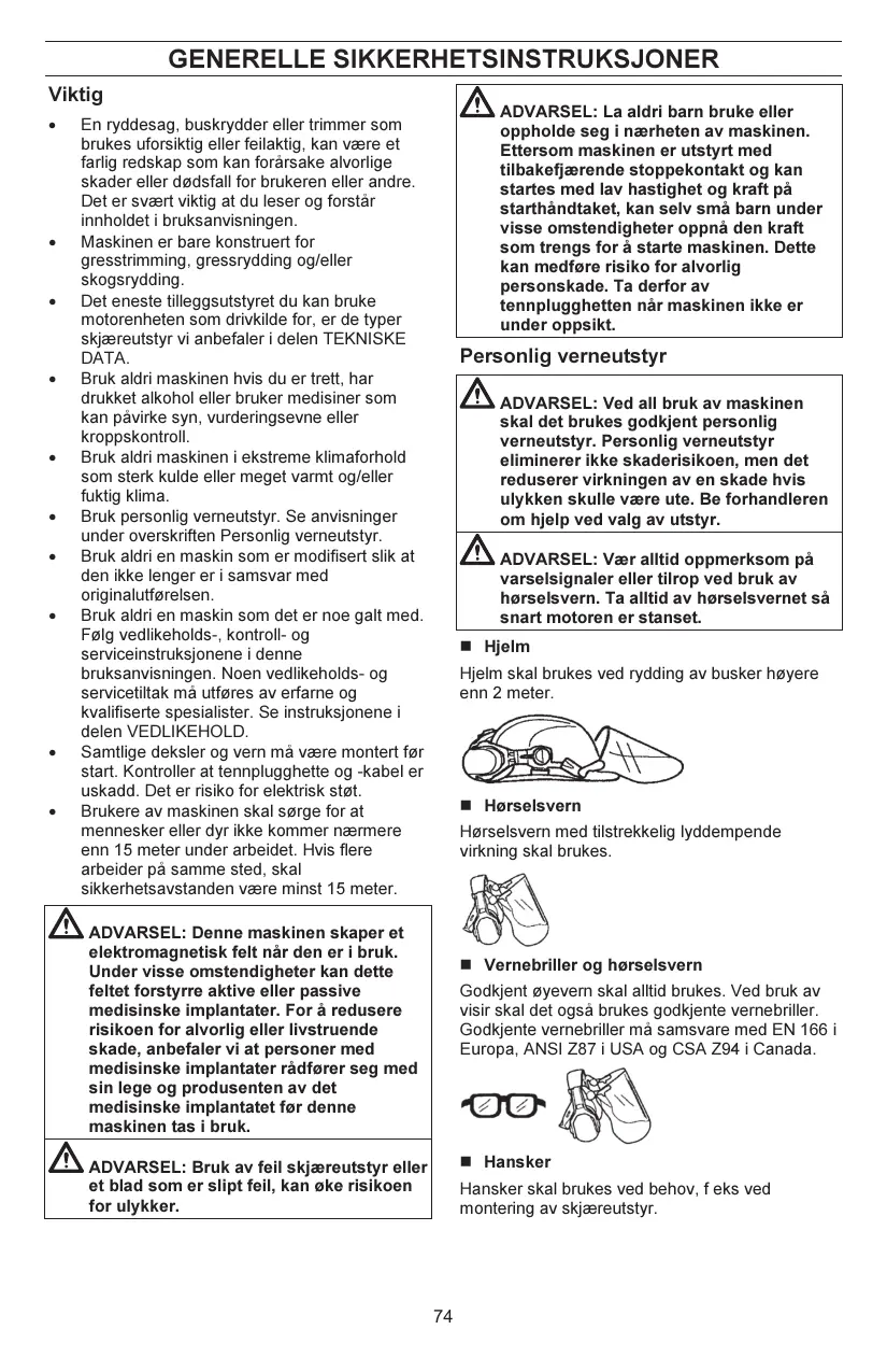 Les seuls accessoires pouvant utiliser le moteur comme source motrice sont les équipements de coupe que nous recommandons à la section « CARACTÉRISTIQUES TECHNIQUES ». N’utilisez jamais la machine en cas de fatigue, d’absorption d’alcool ou de prise de médicaments susceptibles d’affecter l’acuité visuelle, le jugement ou la coordination. Ne jamais utiliser la machine dans des conditions climatiques extrêmes telles que la froid intense ou climat très chaud et/ou humide. Portez un équipement de protection personnelle. Voir les instructions au chapitre « Équipement de protection personnelle ». Ne jamais utiliser une machine qui a été modifiée au point de ne plus être conforme au modèle original. Ne jamais utiliser une machine qui n’est pas en parfait état de marche. Suivre dans ce manuel d’utilisation les instructions de maintenance, de contrôle et d’entretien. Certaines mesures de maintenance et d’entretien doivent être confiées à un spécialiste dûment formé et qualifié. Voir les instructions au chapitre « MAINTENANCE ». Tous les carters et toutes les protections doivent être montés avant le démarrage. Vérifiez que le chapeau de bougie et le câble d’allumage ne sont pas endommagés. Risque de chocs électriques. L’utilisateur de la machine doit s’assurer qu’aucune personne ou animal ne s’approche à moins de 15 mètres pendant le travail. Lorsque plusieurs utilisateurs travaillent dans une même zone, il convient d’observer une distance de sécurité d’au moins 15 mètres.
