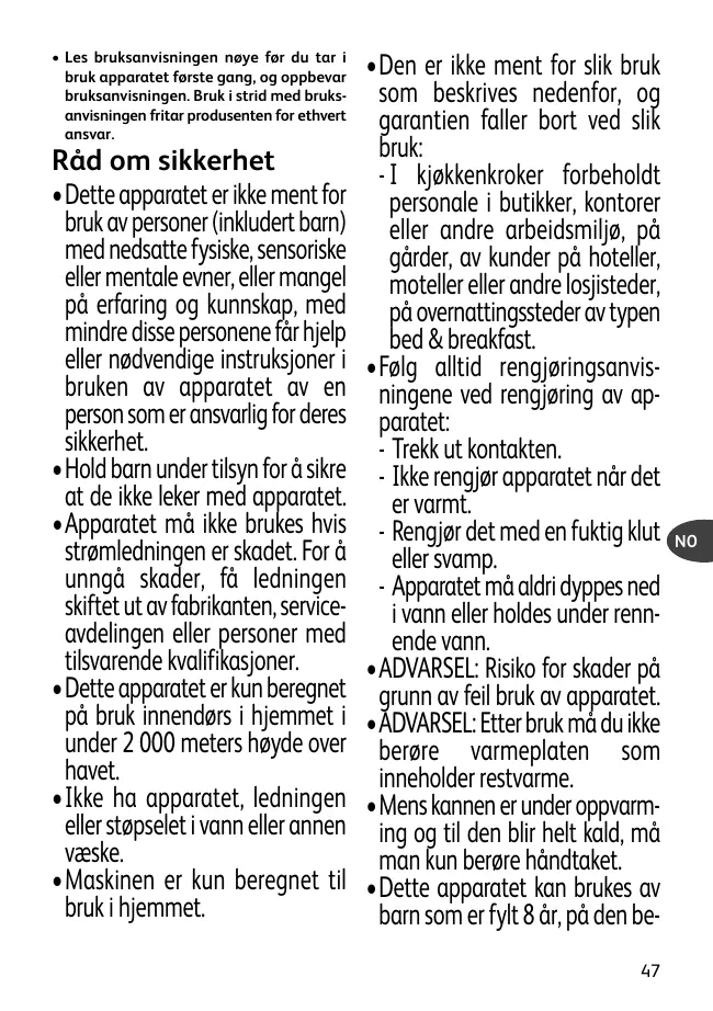 •Den er ikke ment for slik bruk som beskrives nedenfor, og garantien faller bort ved slik bruk: - I kjøkkenkroker forbeholdt personale i butikker, kontorer eller andre arbeidsmiljø, på gårder, av kunder på hoteller, moteller eller andre losjisteder, på overnattingssteder av typen bed & breakfast. •Følg alltid rengjøringsanvisningene ved rengjøring av apparatet: - Trekk ut kontakten. - Ikke rengjør apparatet når det er varmt. - Rengjør det med en fuktig klut eller svamp. - Apparatet må aldri dyppes ned i vann eller holdes under rennende vann. •ADVARSEL: Risiko for skader på grunn av feil bruk av apparatet. •ADVARSEL: Etter bruk må du ikke berøre varmeplaten som inneholder restvarme. •Mens kannen er under oppvarming og til den blir helt kald, må man kun berøre håndtaket. •Dette apparatet kan brukes av barn som er fylt 8 år, på den be47