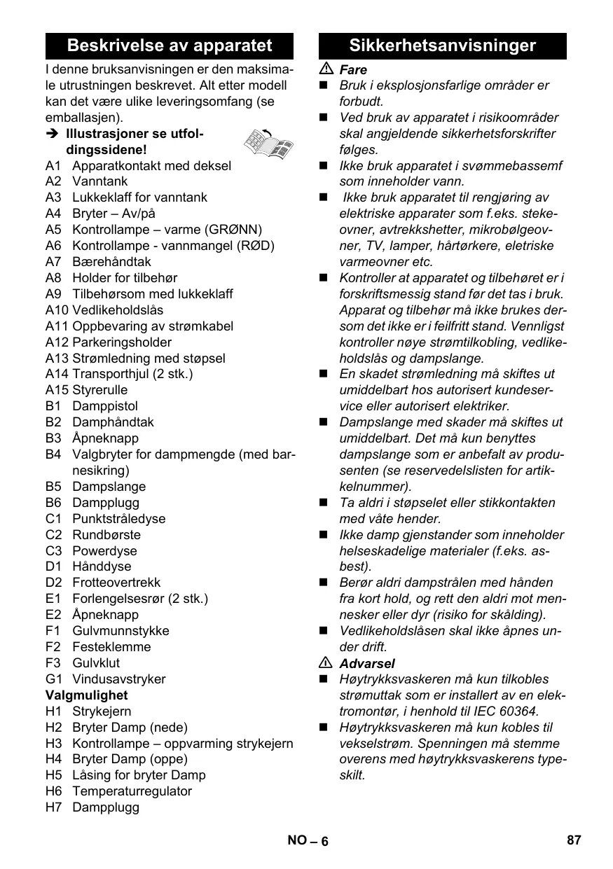 NO – 5 Se side 2 for illustrasjoner Fyll vanntanken opp til merket „MAX“. Stikk damppluggen inn i apparatkontakten. Sett i støpselet. Slå apparatet på. Kontrolllampe - varme blinker grønn. vent til kontrollampe - varme lyser konstant. Monter tilbehør på damppistolen. Damprenseren er driftsklar. Beskrivelse av apparatet Sikkerhetsanvisninger I denne bruksanvisningen er den maksimale utrustningen beskrevet. Alt etter modell kan det være ulike leveringsomfang (se emballasjen). Î Illustrasjoner se utfoldingssidene! A1 Apparatkontakt med deksel A2 Vanntank A3 Lukkeklaff for vanntank A4 Bryter – Av/på A5 Kontrollampe – varme (GRØNN) A6 Kontrollampe - vannmangel (RØD) A7 Bærehåndtak A8 Holder for tilbehør A9 Tilbehørsom med lukkeklaff A10 Vedlikeholdslås A11 Oppbevaring av strømkabel A12 Parkeringsholder A13 Strømledning med støpsel A14 Transporthjul (2 stk.) A15 Styrerulle B1 Damppistol B2 Damphåndtak B3 Åpneknapp B4 Valgbryter for dampmengde (med barnesikring) B5 Dampslange B6 Dampplugg C1 Punktstråledyse C2 Rundbørste C3 Powerdyse D1 Hånddyse D2 Frotteovertrekk E1 Forlengelsesrør (2 stk.) E2 Åpneknapp F1 Gulvmunnstykke F2 Festeklemme F3 Gulvklut G1 Vindusavstryker Valgmulighet H1 Strykejern H2 Bryter Damp (nede) H3 Kontrollampe – oppvarming strykejern H4 Bryter Damp (oppe) H5 Låsing for bryter Damp H6 Temperaturregulator H7 Dampplugg Fare Bruk i eksplosjonsfarlige områder er forbudt. Ved bruk av apparatet i risikoområder skal angjeldende sikkerhetsforskrifter følges. Ikke bruk apparatet i svømmebassemf som inneholder vann. Ikke bruk apparatet til rengjøring av elektriske apparater som f.eks. stekeovner, avtrekkshetter, mikrobølgeovner, TV, lamper, hårtørkere, eletriske varmeovner etc. Kontroller at apparatet og tilbehøret er i forskriftsmessig stand før det tas i bruk. Apparat og tilbehør må ikke brukes dersom det ikke er i feilfritt stand. Vennligst kontroller nøye strømtilkobling, vedlikeholdslås og dampslange. En skadet strømledning må skiftes ut umiddelbart hos autorisert kundeservice eller autorisert elektriker. Dampslange med skader må skiftes ut umiddelbart. Det må kun benyttes dampslange som er anbefalt av produsenten (se reservedelslisten for artikkelnummer). Ta aldri i støpselet eller stikkontakten med våte hender. Ikke damp gjenstander som inneholder helseskadelige materialer (f.eks. asbest). Berør aldri dampstrålen med hånden fra kort hold, og rett den aldri mot mennesker eller dyr (risiko for skålding). Vedlikeholdslåsen skal ikke åpnes under drift. 몇 Advarsel Høytrykksvaskeren må kun tilkobles strømuttak som er installert av en elektromontør, i henhold til IEC 60364. Høytrykksvaskeren må kun kobles til vekselstrøm. Spenningen må stemme overens med høytrykksvaskerens typeskilt. NO – 6