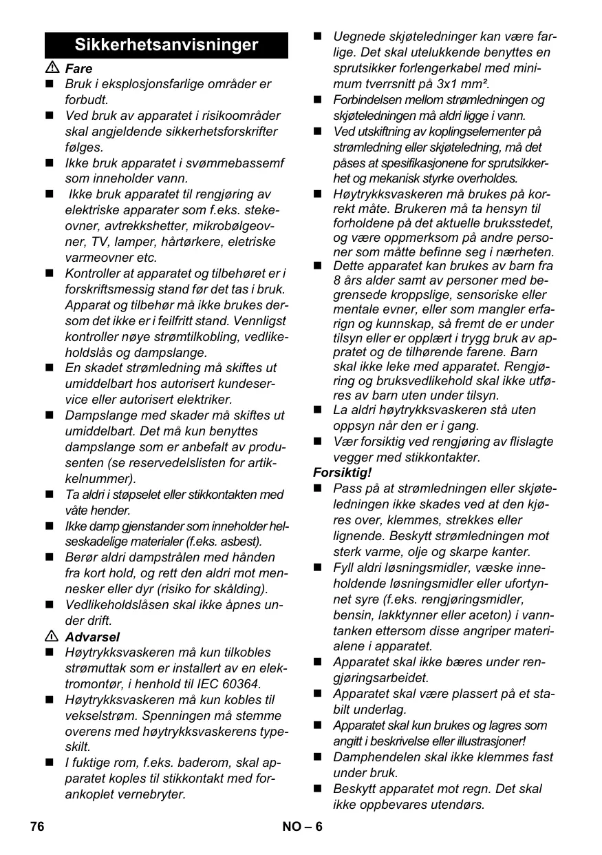 Sikkerhetsanvisninger Fare Bruk i eksplosjonsfarlige områder er forbudt. Ved bruk av apparatet i risikoområder skal angjeldende sikkerhetsforskrifter følges. Ikke bruk apparatet i svømmebassemf som inneholder vann. Ikke bruk apparatet til rengjøring av elektriske apparater som f.eks. stekeovner, avtrekkshetter, mikrobølgeovner, TV, lamper, hårtørkere, eletriske varmeovner etc. Kontroller at apparatet og tilbehøret er i forskriftsmessig stand før det tas i bruk. Apparat og tilbehør må ikke brukes dersom det ikke er i feilfritt stand. Vennligst kontroller nøye strømtilkobling, vedlikeholdslås og dampslange. En skadet strømledning må skiftes ut umiddelbart hos autorisert kundeservice eller autorisert elektriker. Dampslange med skader må skiftes ut umiddelbart. Det må kun benyttes dampslange som er anbefalt av produsenten (se reservedelslisten for artikkelnummer). Ta aldri i støpselet eller stikkontakten med våte hender. Ikke damp gjenstander som inneholder helseskadelige materialer (f.eks. asbest). Berør aldri dampstrålen med hånden fra kort hold, og rett den aldri mot mennesker eller dyr (risiko for skålding). Vedlikeholdslåsen skal ikke åpnes under drift. 몇 Advarsel Høytrykksvaskeren må kun tilkobles strømuttak som er installert av en elektromontør, i henhold til IEC 60364. Høytrykksvaskeren må kun kobles til vekselstrøm. Spenningen må stemme overens med høytrykksvaskerens typeskilt. I fuktige rom, f.eks. baderom, skal apparatet koples til stikkontakt med forankoplet vernebryter.