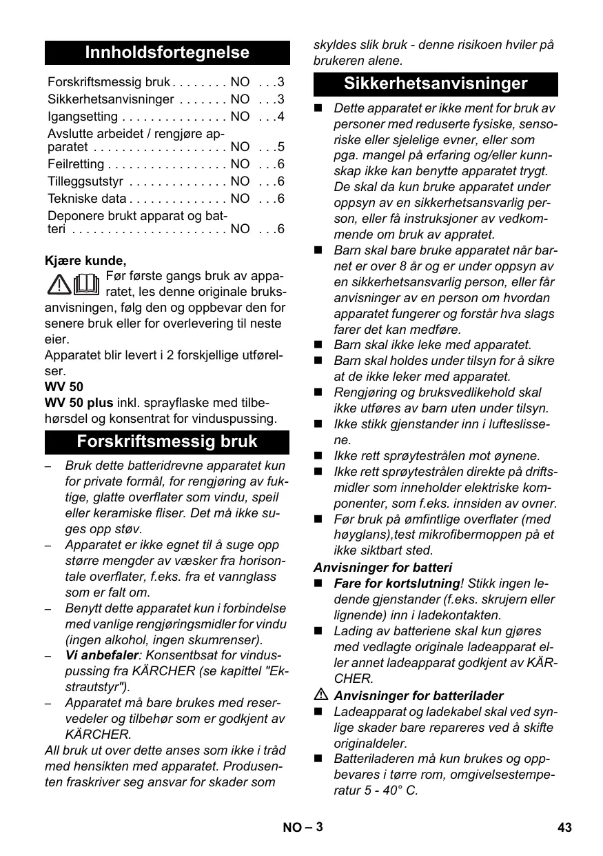 Kjære kunde, Før første gangs bruk av apparatet, les denne originale bruksanvisningen, følg den og oppbevar den for senere bruk eller for overlevering til neste eier. Apparatet blir levert i 2 forskjellige utførelser. WV 50 WV 50 plus inkl. sprayflaske med tilbehørsdel og konsentrat for vinduspussing. Forskriftsmessig bruk Bruk dette batteridrevne apparatet kun for private formål, for rengjøring av fuktige, glatte overflater som vindu, speil eller keramiske fliser. Det må ikke suges opp støv. – Apparatet er ikke egnet til å suge opp større mengder av væsker fra horisontale overflater, f.eks. fra et vannglass som er falt om. – Benytt dette apparatet kun i forbindelse med vanlige rengjøringsmidler for vindu (ingen alkohol, ingen skumrenser). – Vi anbefaler: Konsentbsat for vinduspussing fra KÄRCHER (se kapittel "Ekstrautstyr"). – Apparatet må bare brukes med reservedeler og tilbehør som er godkjent av KÄRCHER. All bruk ut over dette anses som ikke i tråd med hensikten med apparatet. Produsenten fraskriver seg ansvar for skader som