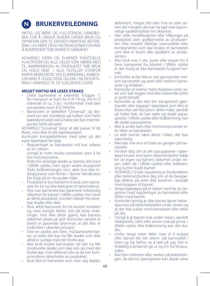• Ce siège-auto est homologué “Universel” et peut donc être installé sur la quasi totalité des véhicules en l’accrochant à l’aide de la ceinture à trois points du siège de la voiture. ATTENTION ! “Universel” signifie qu’il est compatible avec la plupart des véhicules – ce qui ne signifie pas tous les véhicules. Il faut donc vérifier la compatibilité du siège-auto avec votre voiture avant l’achat. • Le réglage du siège-auto doit être fait uniquement par un adulte. • Ne pas utiliser ce produit sans avoir préalablement lu les instructions. • Le risque de dommages graves pour l’enfant augmente si les indications de cette notice ne sont pas suivies scrupuleusement. Ce risque n’intervient pas uniquement en cas d’accident, mais aussi dans d’autres situations (ex. freinages brusques, etc.). • Le produit est exclusivement destiné à servir de siège-auto. Il n’est pas prévu pour une utilisation à la maison, ou aucune autre utilisation. • Aucun siège-auto ne peut garantir la sécurité totale de l’enfant en cas d’accident,