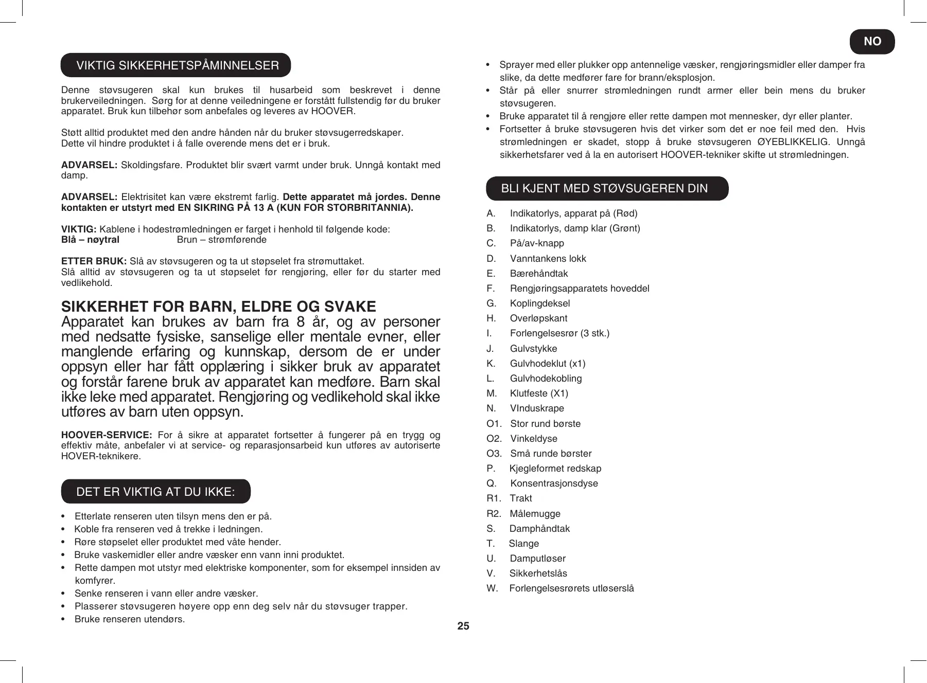 Støtt alltid produktet med den andre hånden når du bruker støvsugerredskaper. Dette vil hindre produktet i å falle overende mens det er i bruk. ADVARSEL: Skoldingsfare. Produktet blir svært varmt under bruk. Unngå kontakt med damp. Sprayer med eller plukker opp antennelige væsker, rengjøringsmidler eller damper fra slike, da dette medfører fare for brann/eksplosjon. Står på eller snurrer strømledningen rundt armer eller bein mens du bruker støvsugeren. Bruke apparatet til å rengjøre eller rette dampen mot mennesker, dyr eller planter. Fortsetter å bruke støvsugeren hvis det virker som det er noe feil med den. Hvis strømledningen er skadet, stopp å bruke støvsugeren ØYEBLIKKELIG. Unngå sikkerhetsfarer ved å la en autorisert HOOVER-tekniker skifte ut strømledningen.